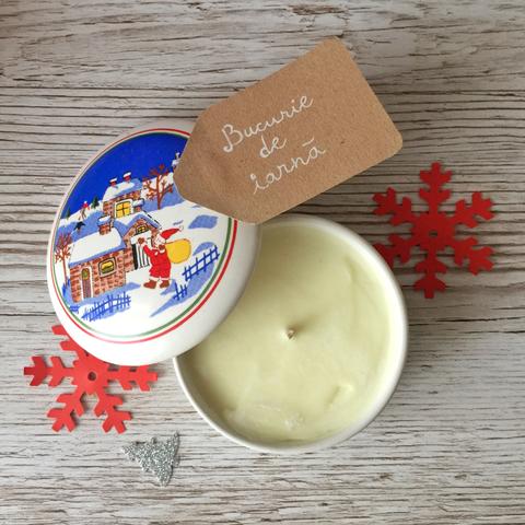 Am început cam târziu să testez aromele de iarnă, pe la jumătatea lui octombie, dar tot atunci am început să decorez prin casă cu elemente de Crăciun. Țin minte că era duminică când am turnat primele lumânări cu aroma „Bucurie de iarnă„, afară ploua și era întunecat, o atmosferă mohorâtă, dar odată ce am amestecat uleiul parfumat cu ceara din soia, toată casa s-a umplut de parfum și parcă s-a luminat, iar eu am fugit repede să pun cântece de Crăciun și să scot decorațiunile de iarnă și instalația.