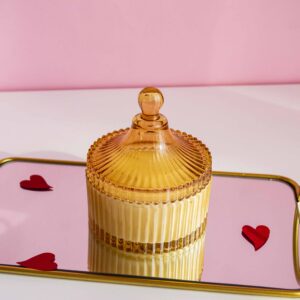 Lumânare parfumată din ceară de soia turnată manual într-o bombonieră prețioasă, din sticlă, de culoare galbenă, cu detalii aurii.