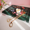 Foarfecă metalică de culoare auriu-rozaliu, pentru scurtarea fitilului.
