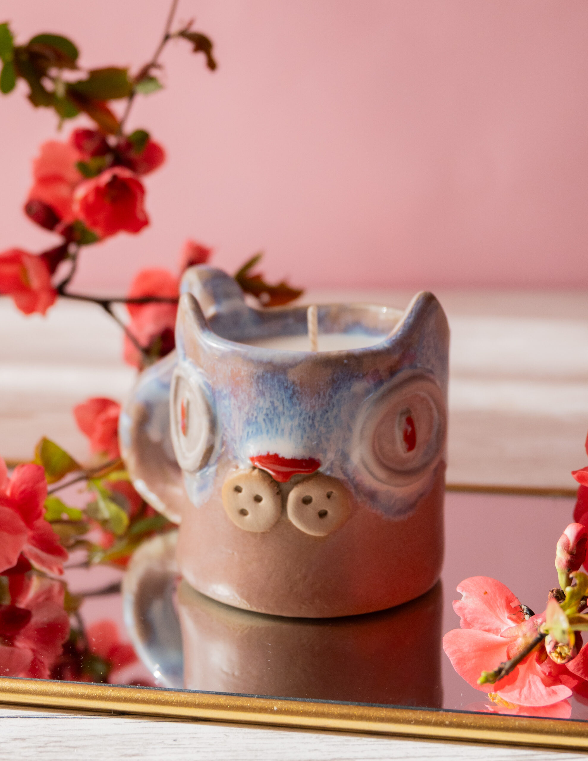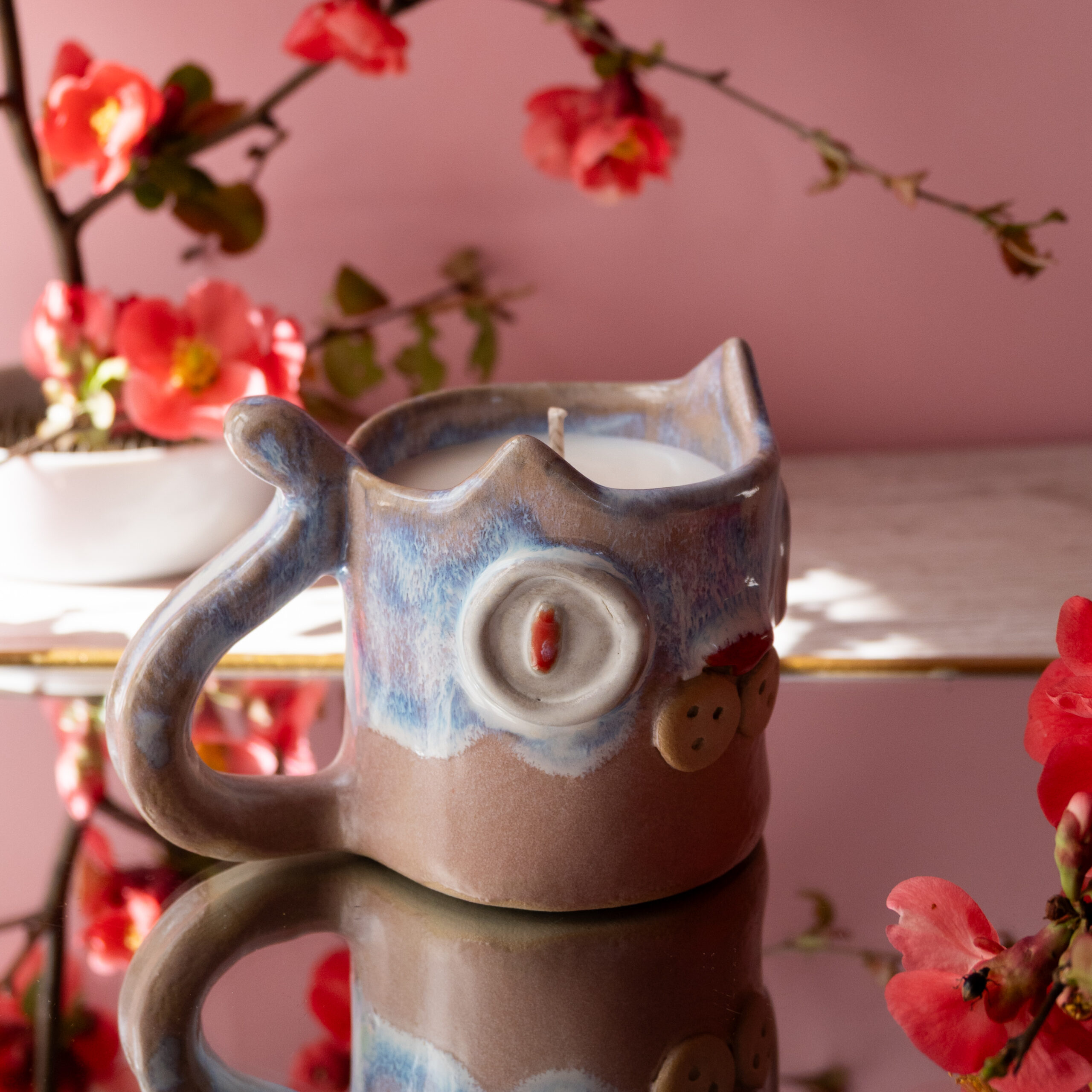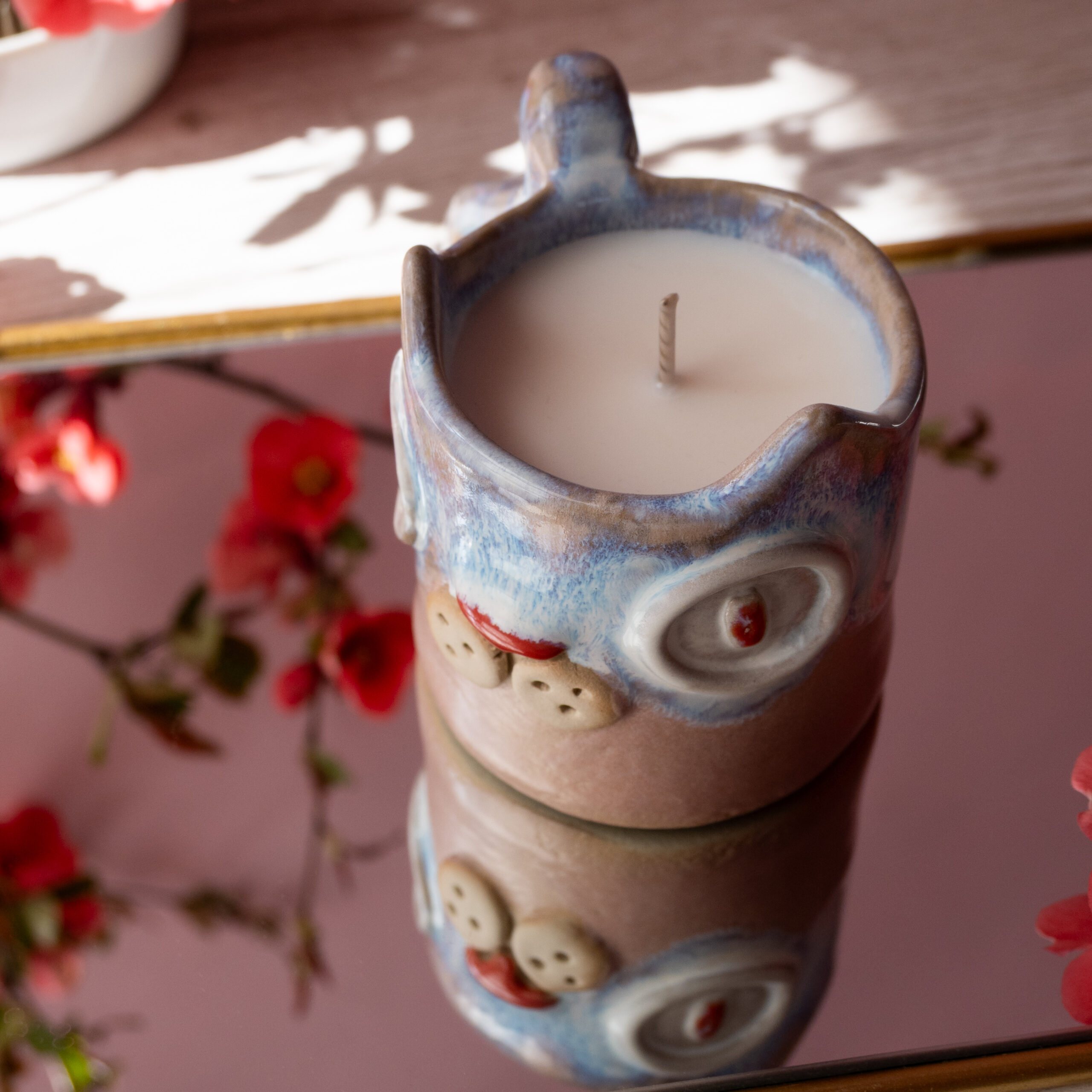 Lumânare parfumată din ceară 100% naturală de soia turnată manual în cană ceramică cu fitil de bumbac pentru o ardere curată și constantă