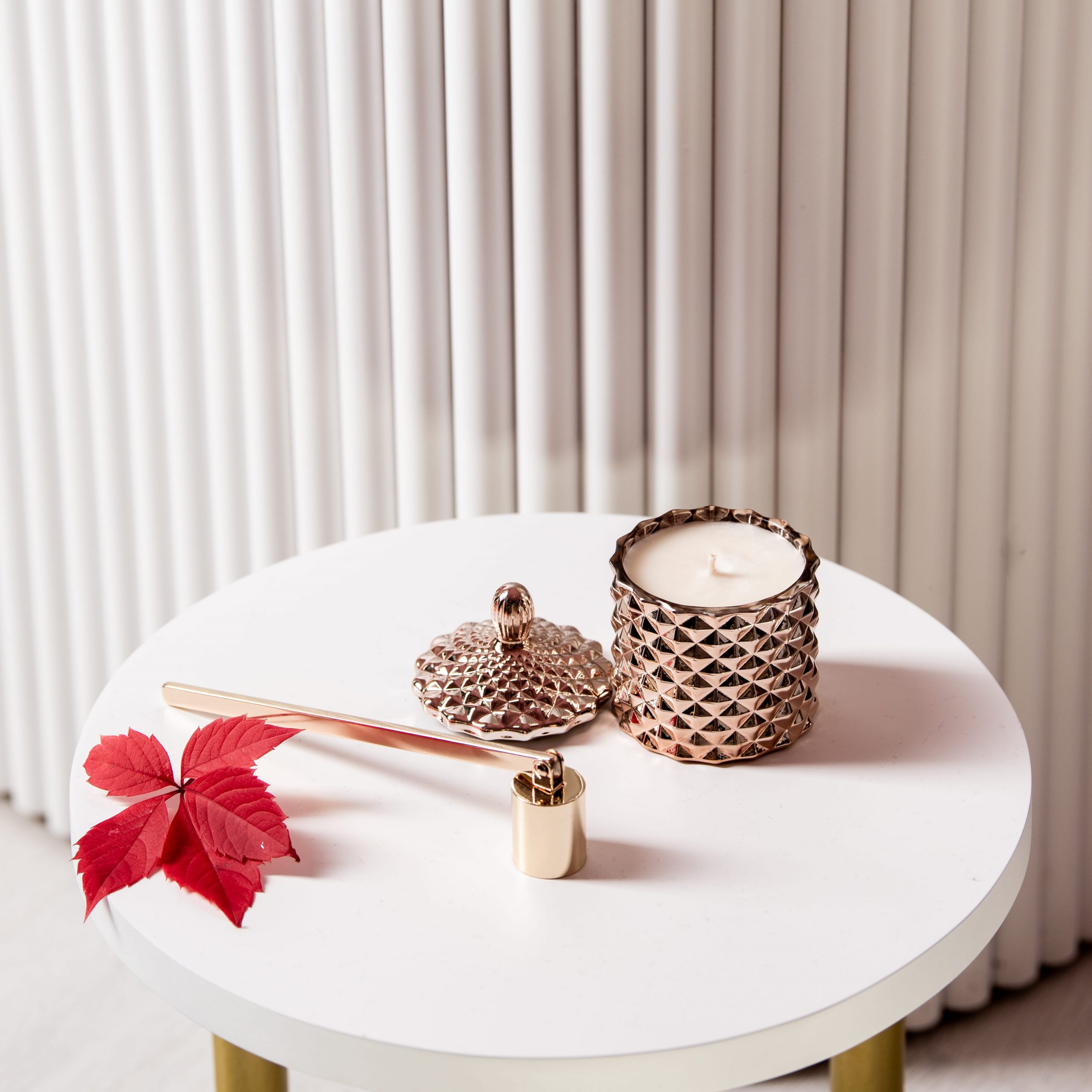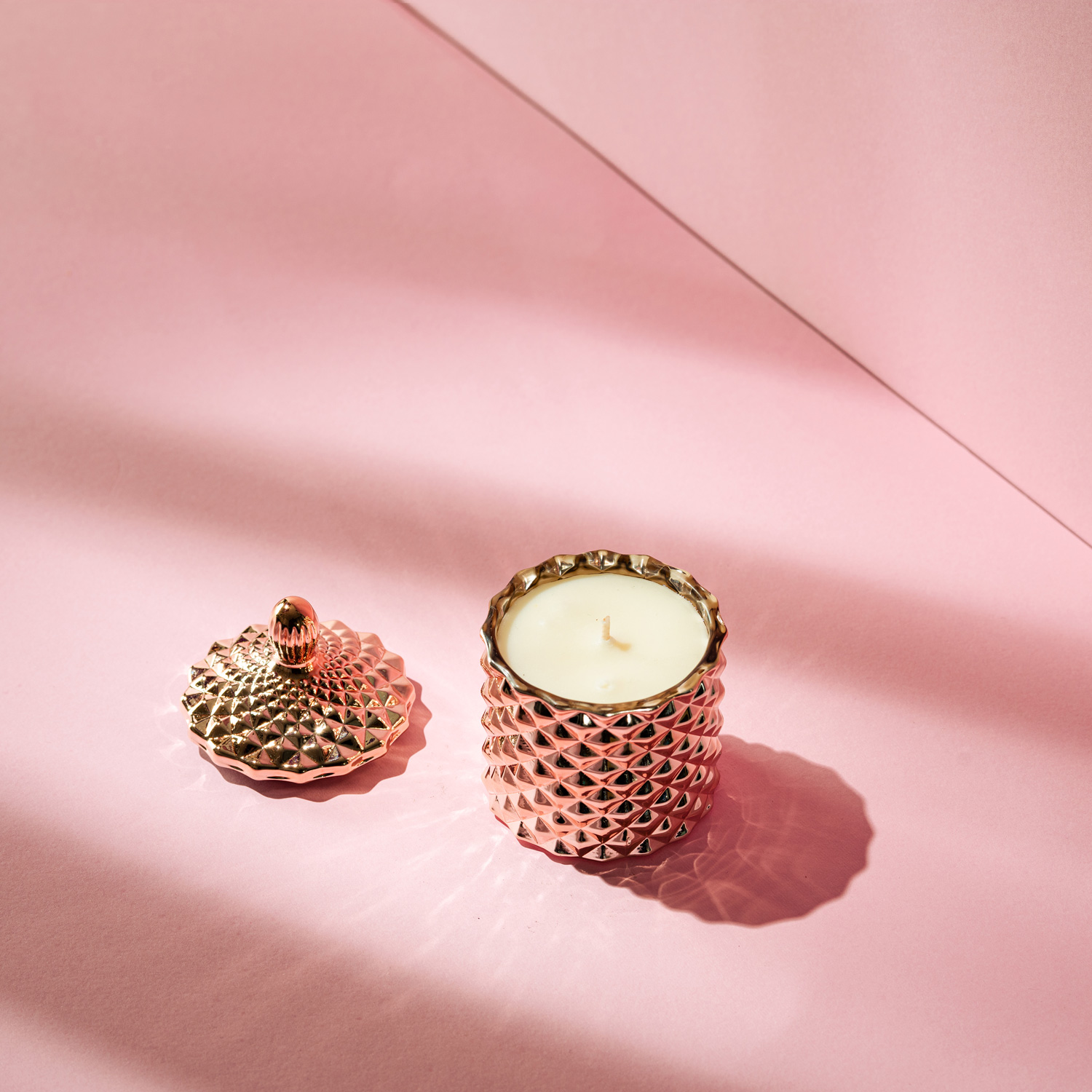 Lumânare parfumată din ceară 100% naturală de soia, turnată manual într-o bombonieră prețioasă, din sticlă termorezistentă, acoperită cu un strat de vopsea auriu rozaliu.