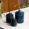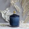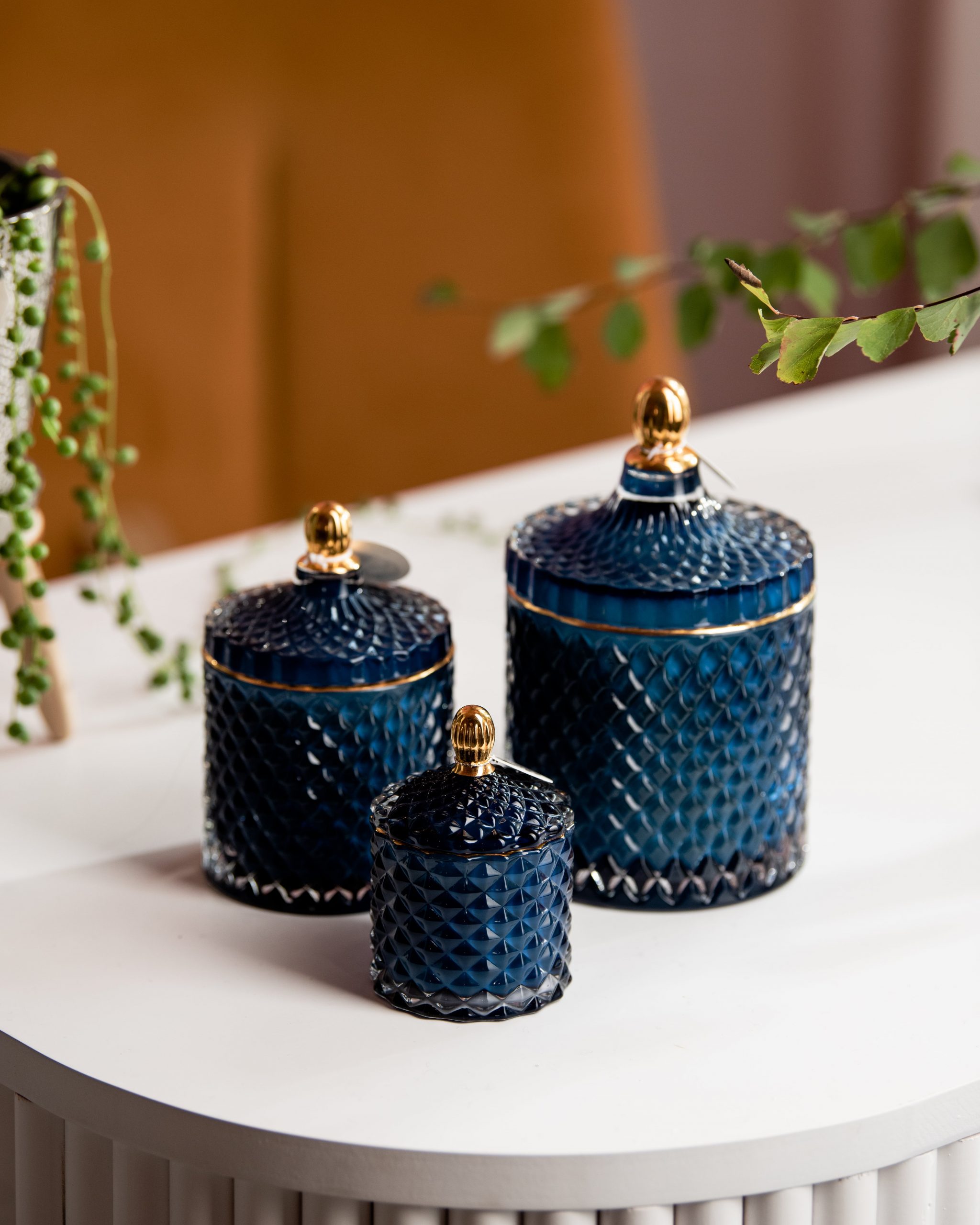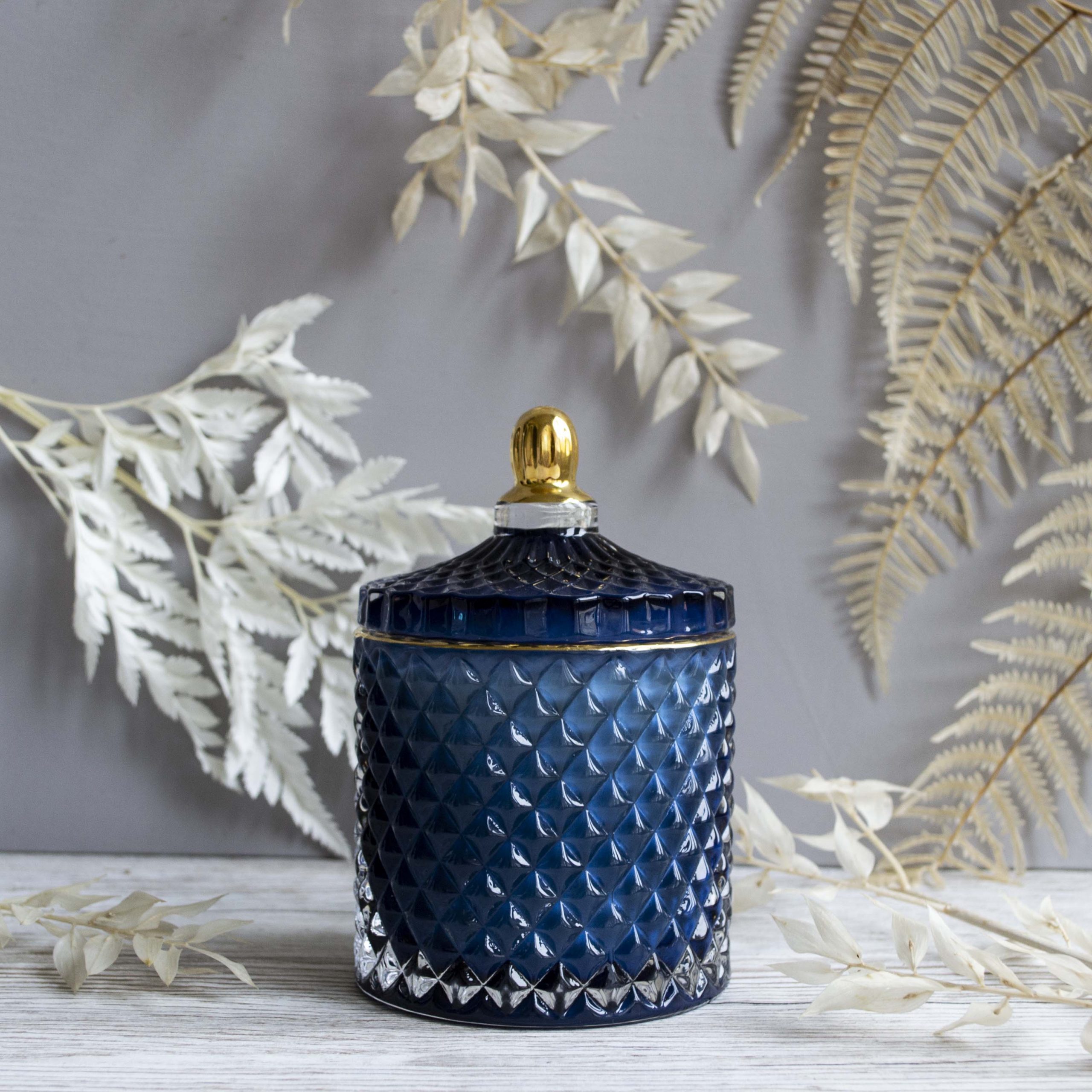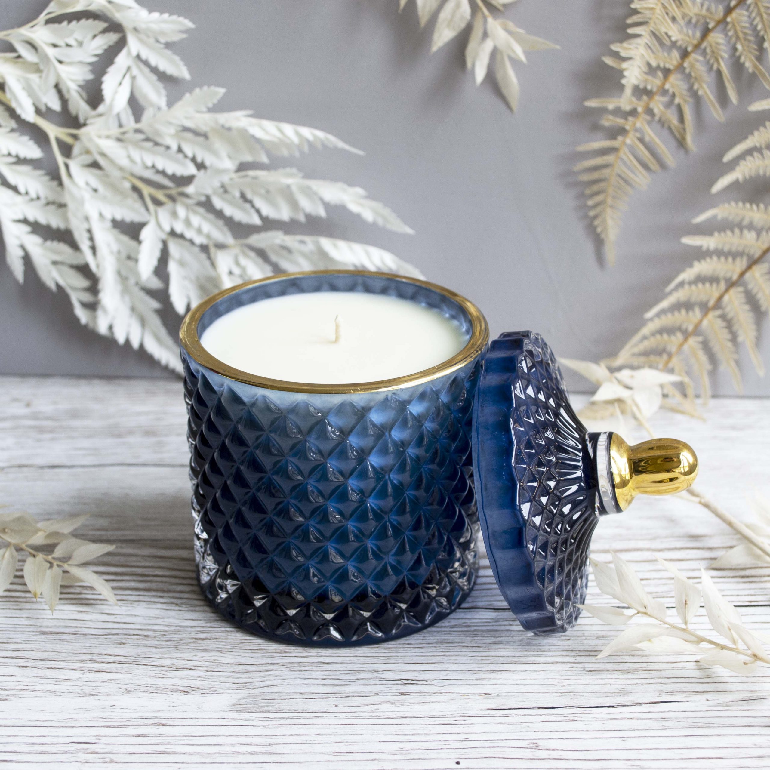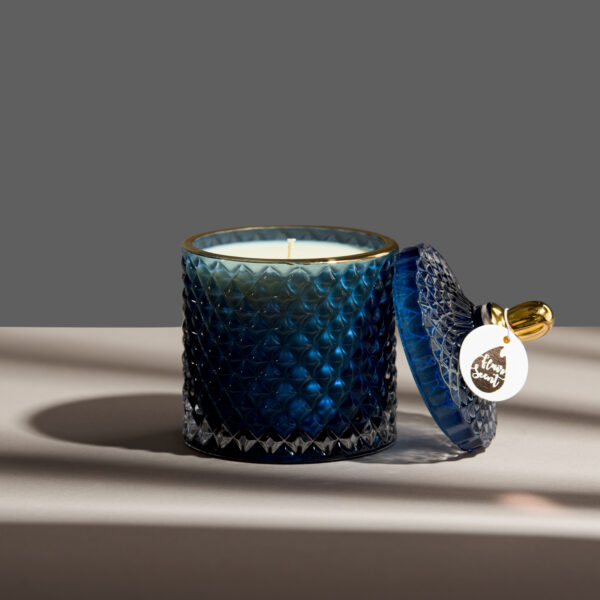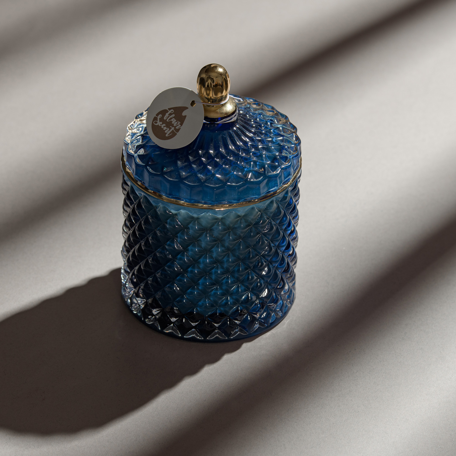 Lumânare parfumată din ceară 100% naturală de soia, turnată manual într-o bombonieră elegantă, din sticlă termorezistentă, albastră cu detalii aurii.