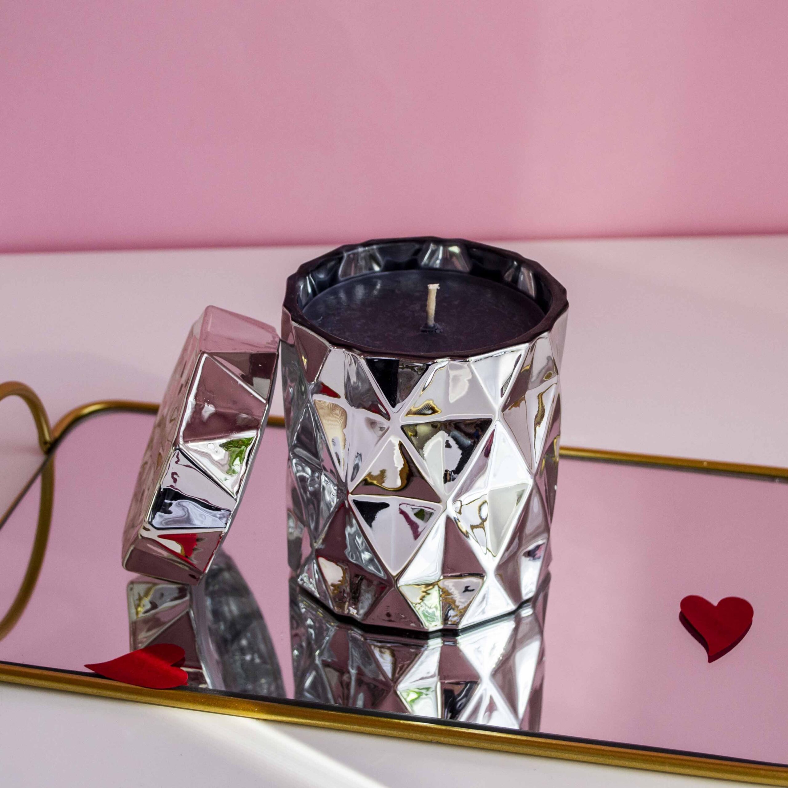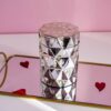 Lumânare parfumată din ceară de soia turnată manual într-o bombonieră modernă, din sticlă, acoperită cu un strat de vopsea argintie.
