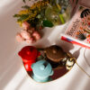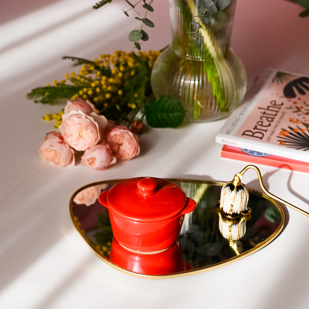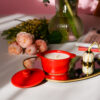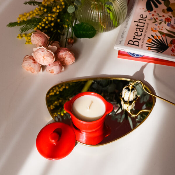 Lumânare parfumată din ceară 100% naturală de soia, turnată manual într-o oliță ceramică roșie cu capac.