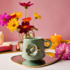 Lumânare parfumată cu Cedru și iasomie în cană ceramică turcoaz cu auriu