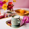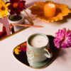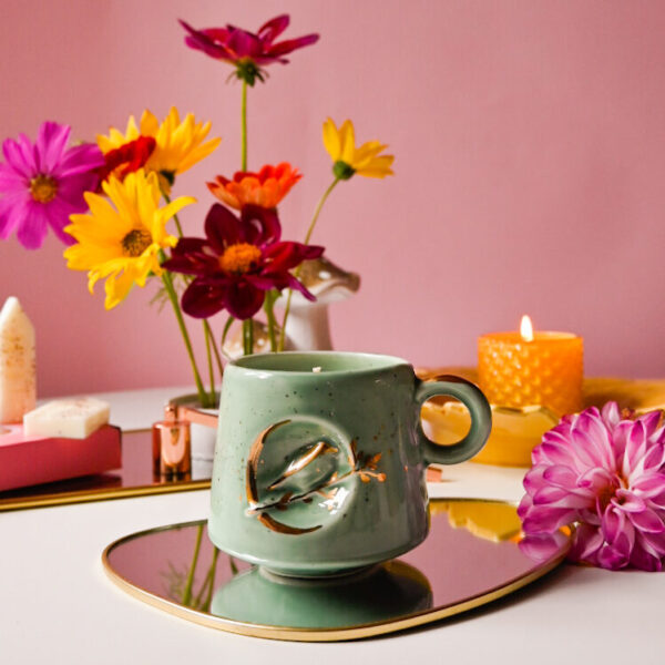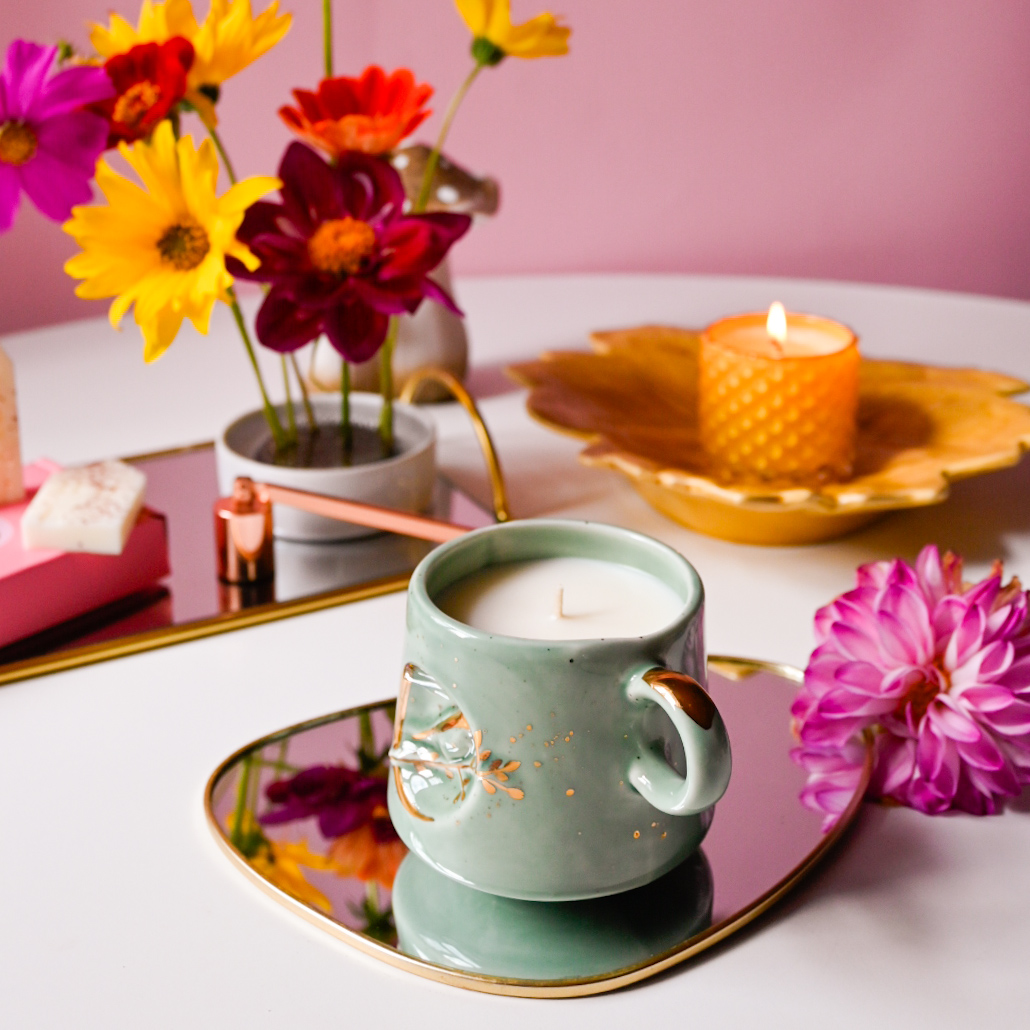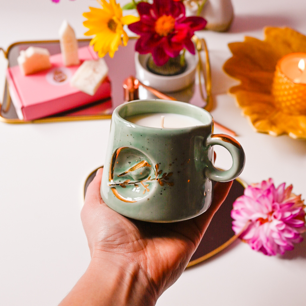 Lumânare parfumată din ceară 100% naturală de soia, turnată manual într-o cană ceramică lucrată manual de Mica Cera. Cana este turcoaz cu detalii aurii și un motiv cu pasăre.
