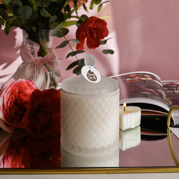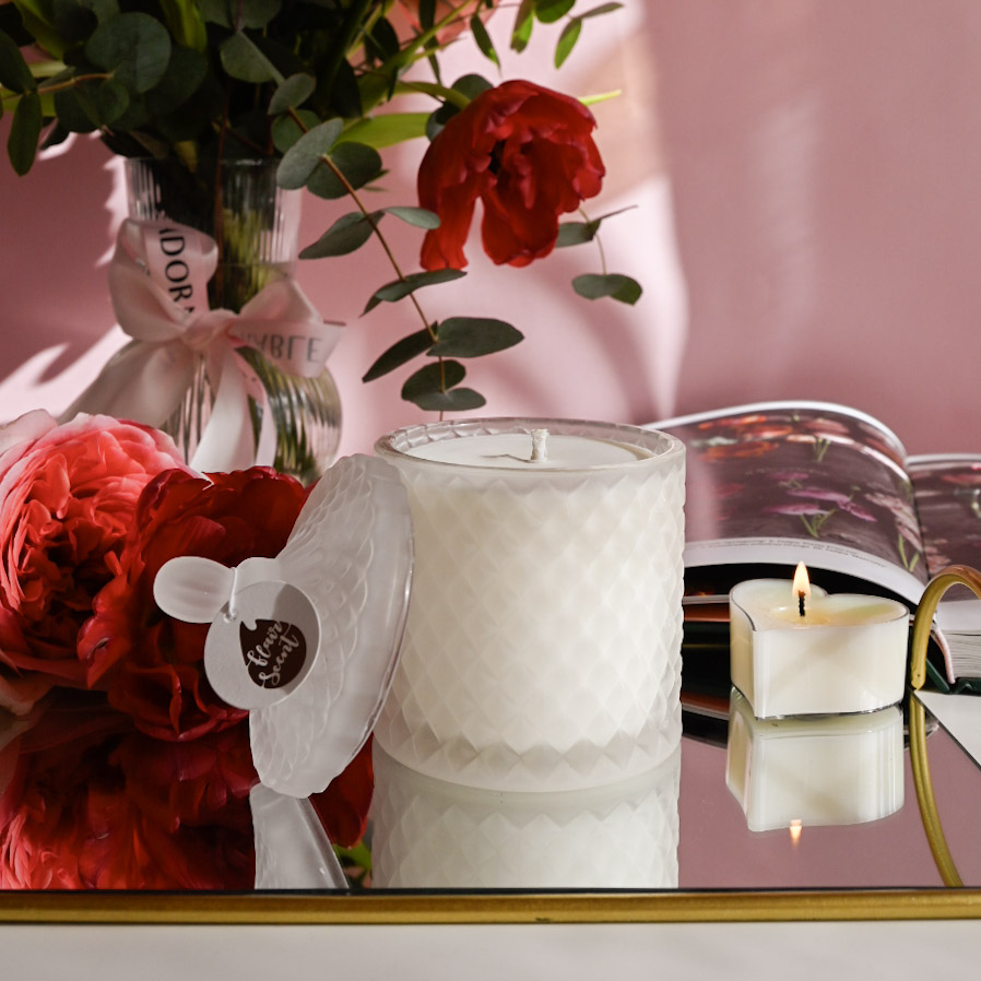Lumânare parfumată din ceară 100% naturală de soia, turnată manual într-o bombonieră elegantă, din sticlă transparentă, mată.