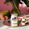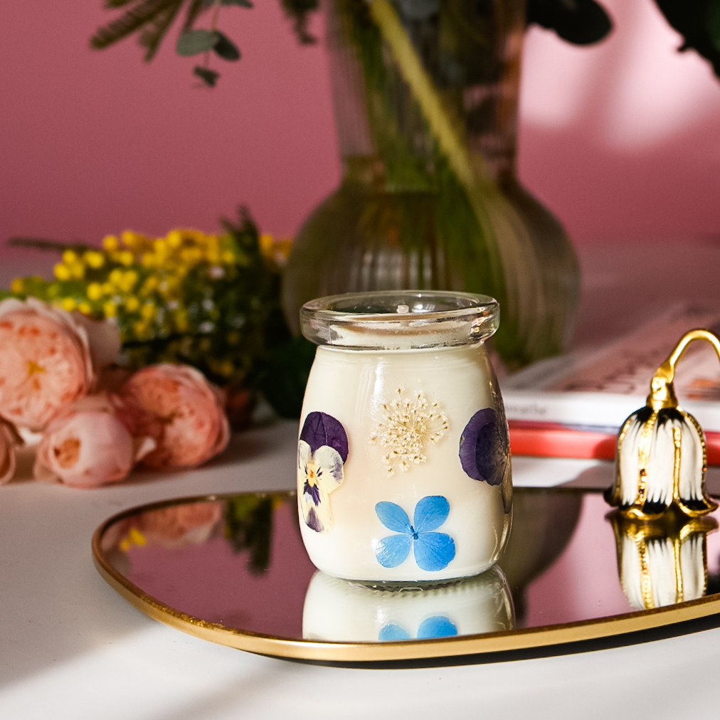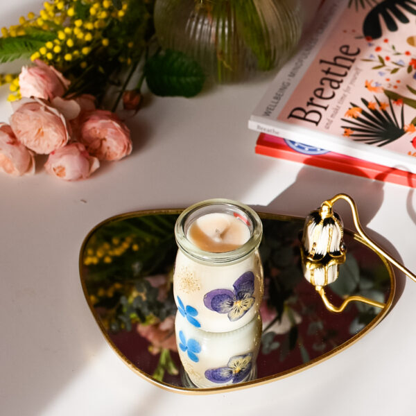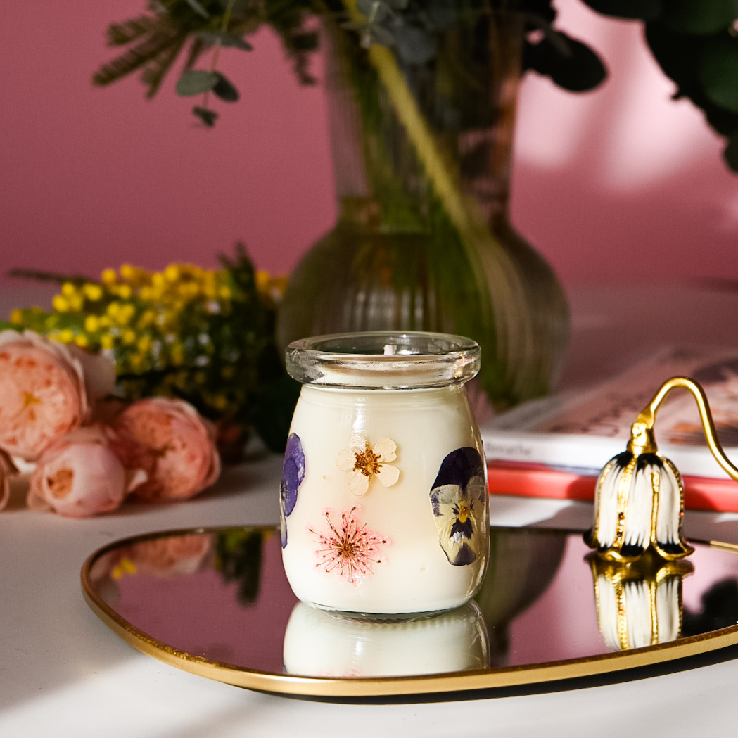 Lumânare parfumată din ceară 100% naturală de soia, turnată manual într-un borcan de sticlă cu flori presate.