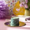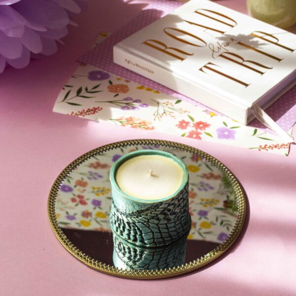 Lumânare parfumată din ceară 100% naturală de soia, turnată manual într-un vas handmade din ceramică tare, cu aspect de solzi de dragon.