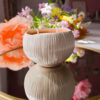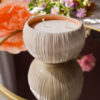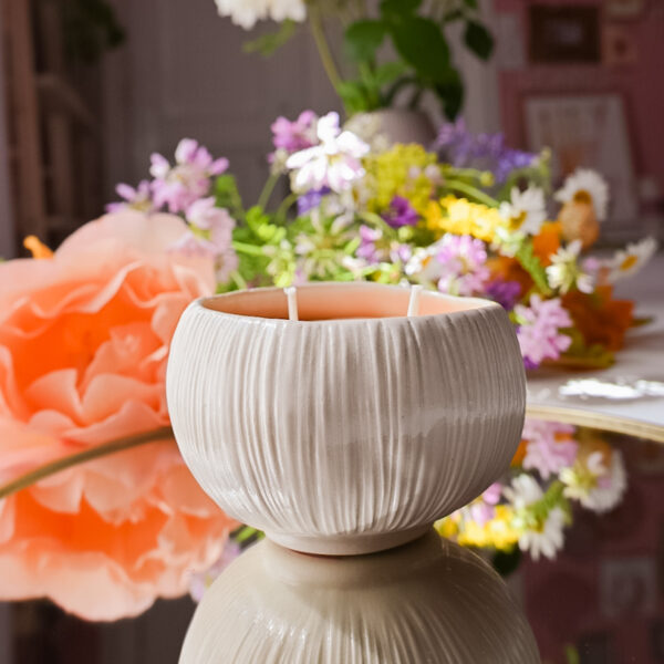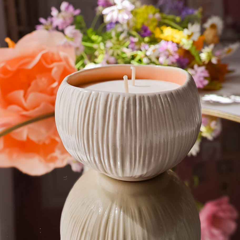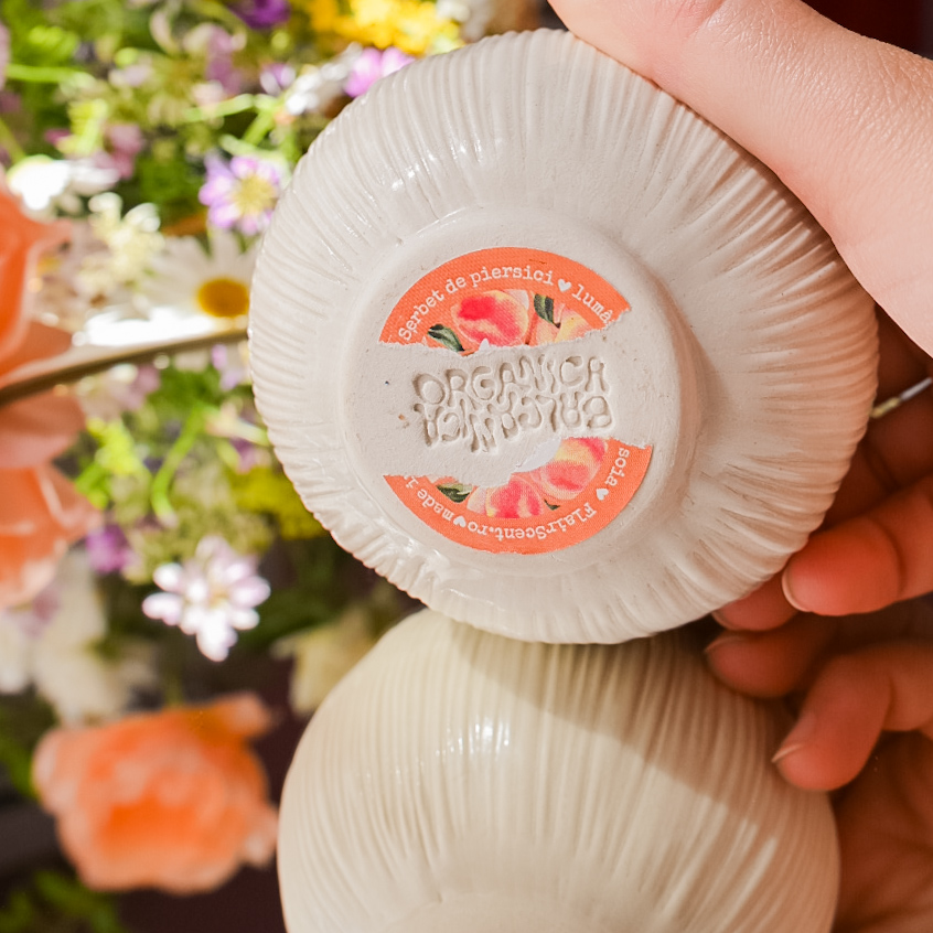 Lumânare parfumată din ceară 100% naturală de soia, turnată manual într-un vas lucrat manual de un artist ceramic local, Organica Balcanica. Vasul are interiorul portocaliu si exteriorul texturat.