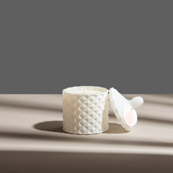 Lumânare parfumată din ceară de soia turnată manual într-o bombonieră prețioasă, din sticlă albă.