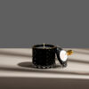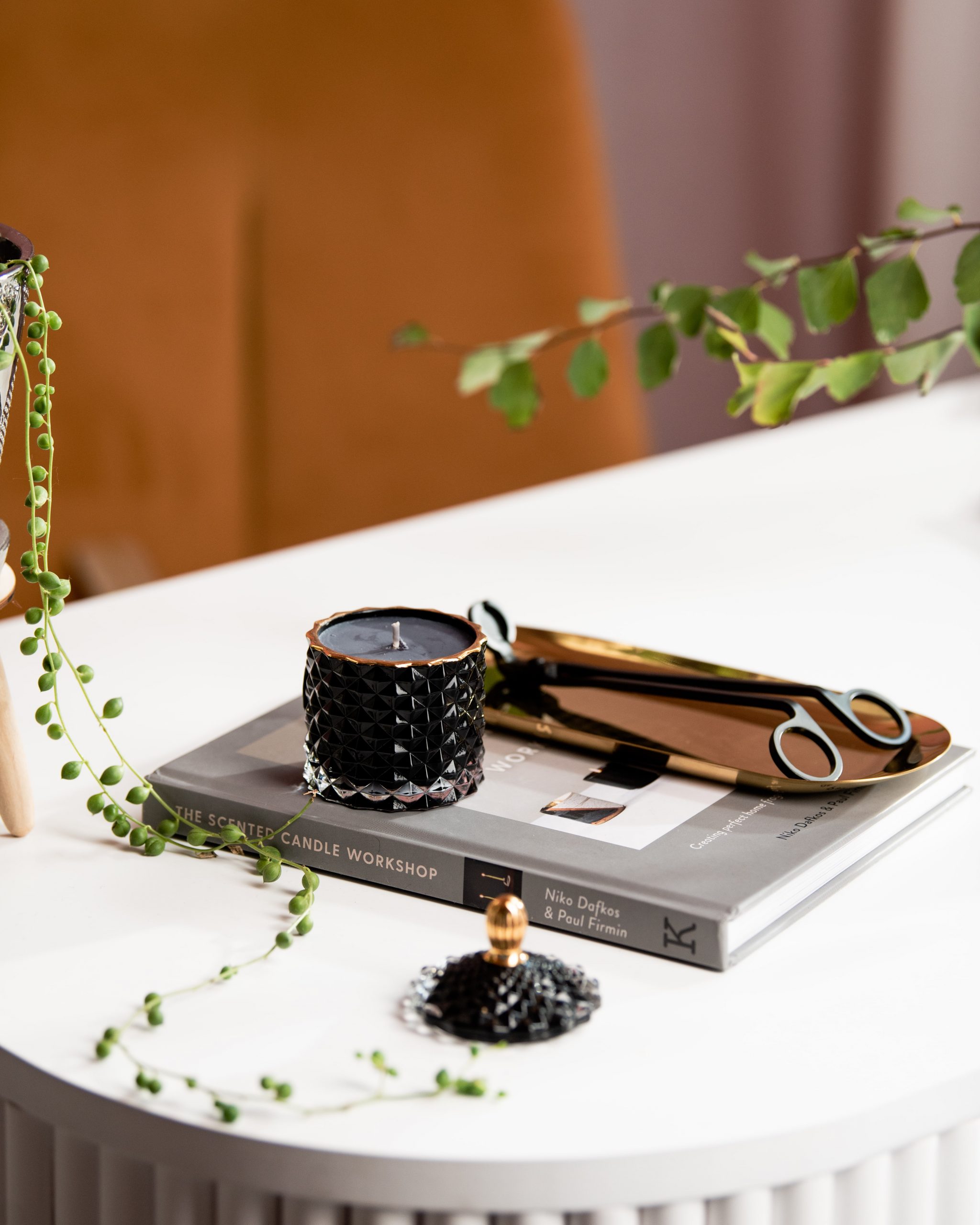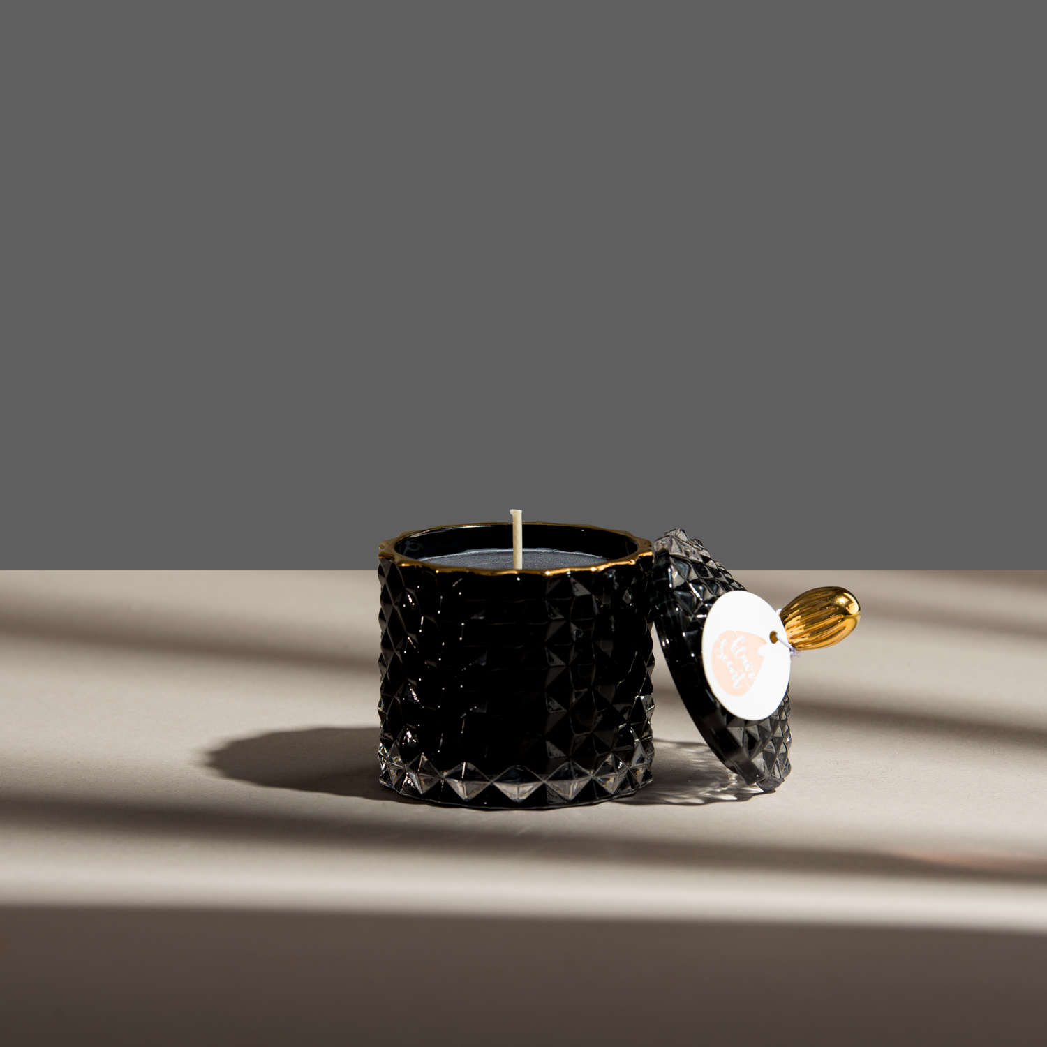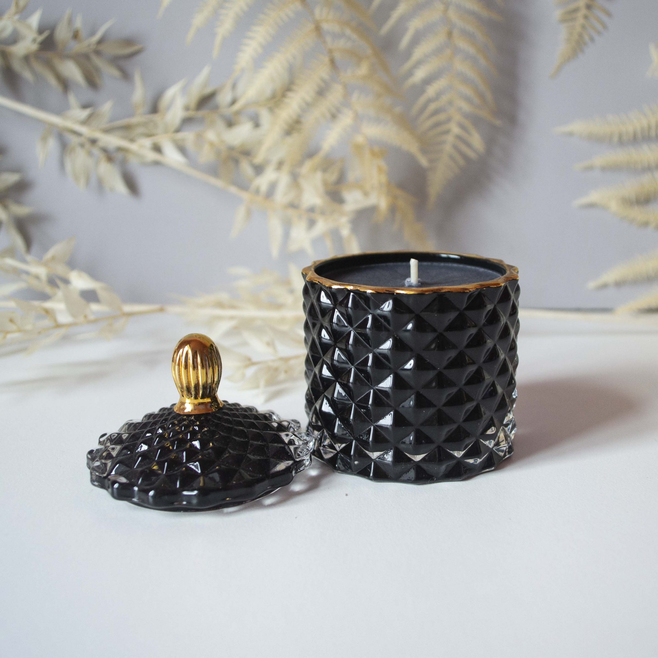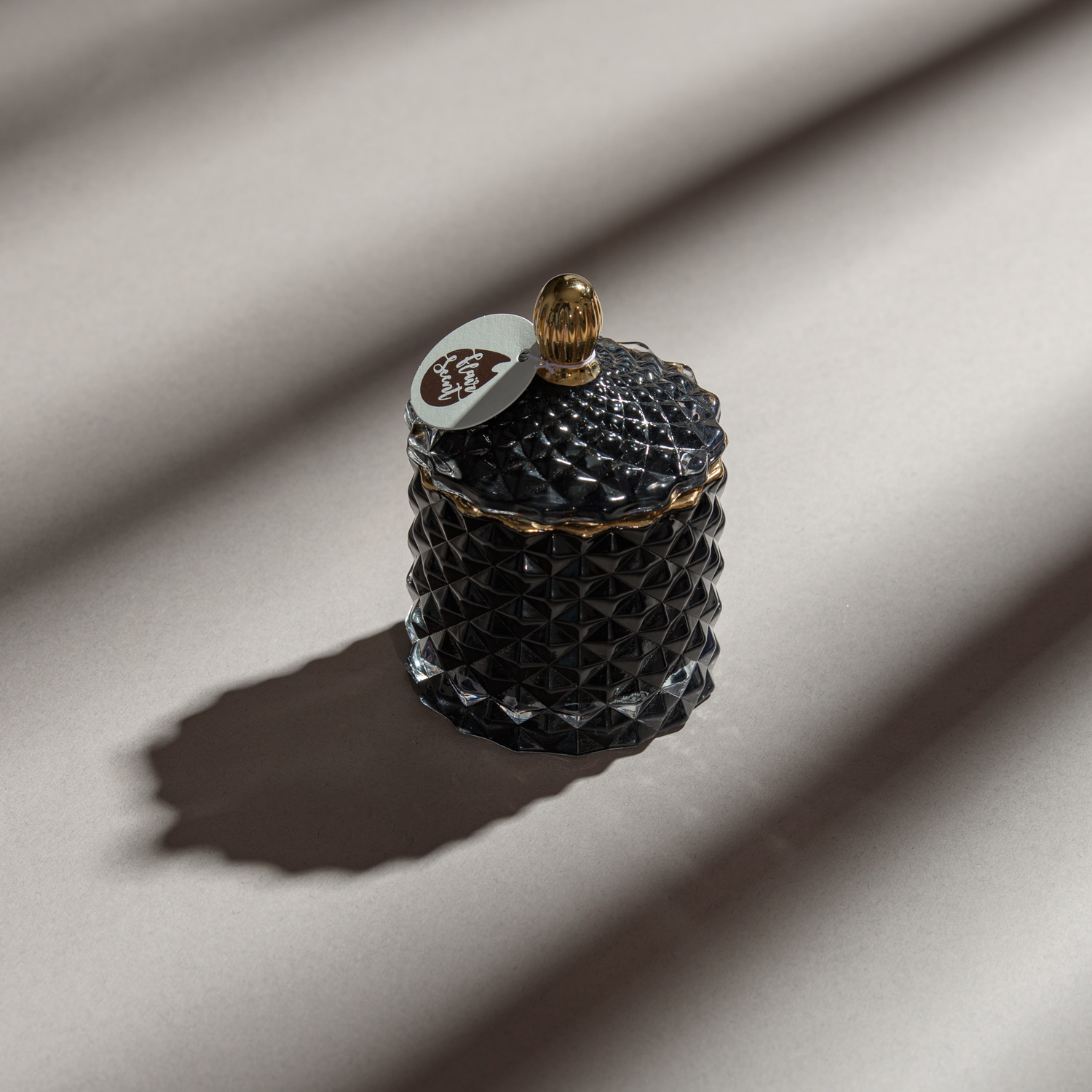 Lumânare parfumată din ceară de soia turnată manual într-o bombonieră prețioasă, din sticlă neagră, cu detalii aurii.
