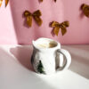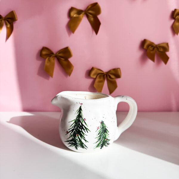 Lumânare parfumată din ceară de soia, handmade, turnată manual într-un vas ceramic în formă de carafă, cu model de iarnă.