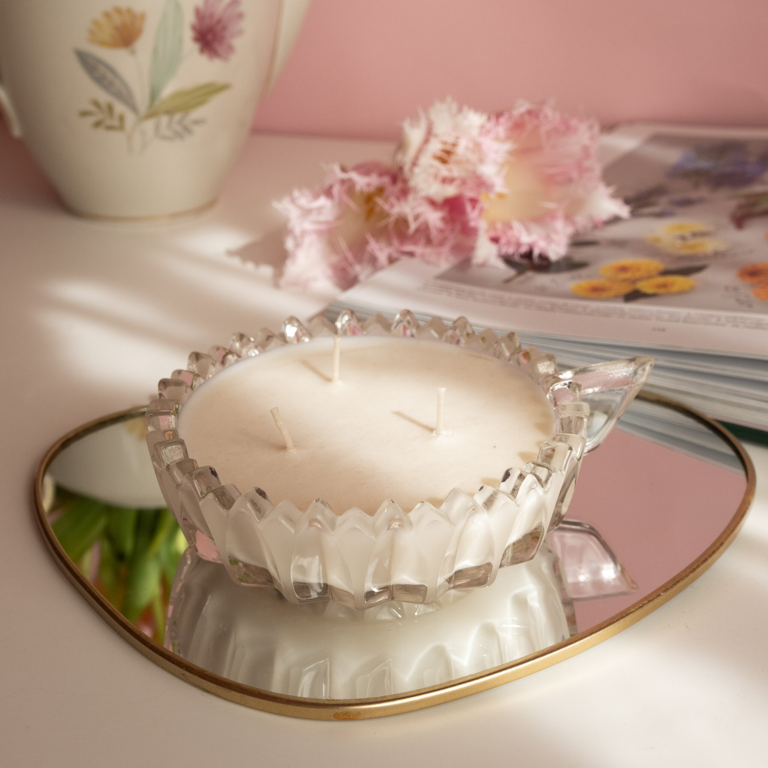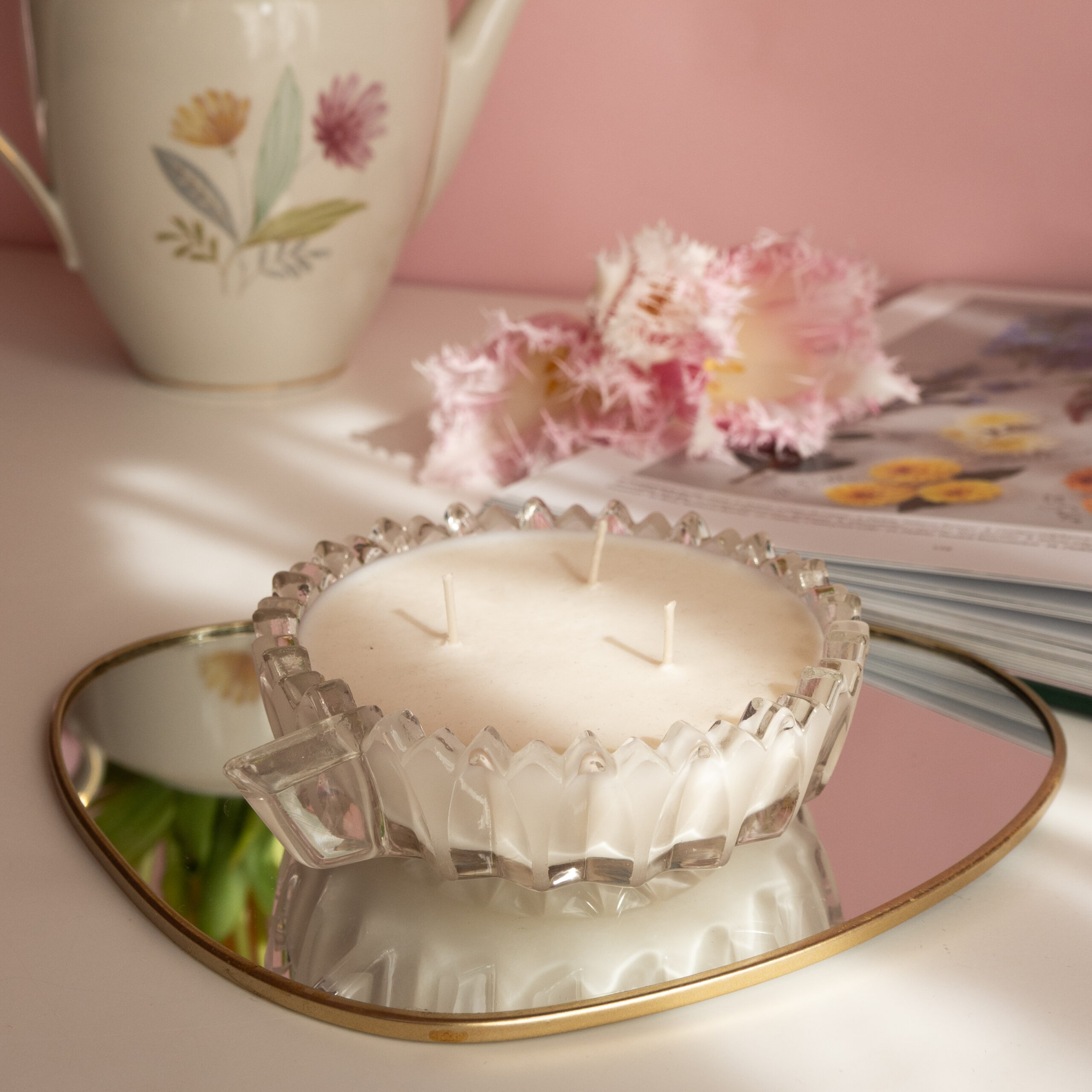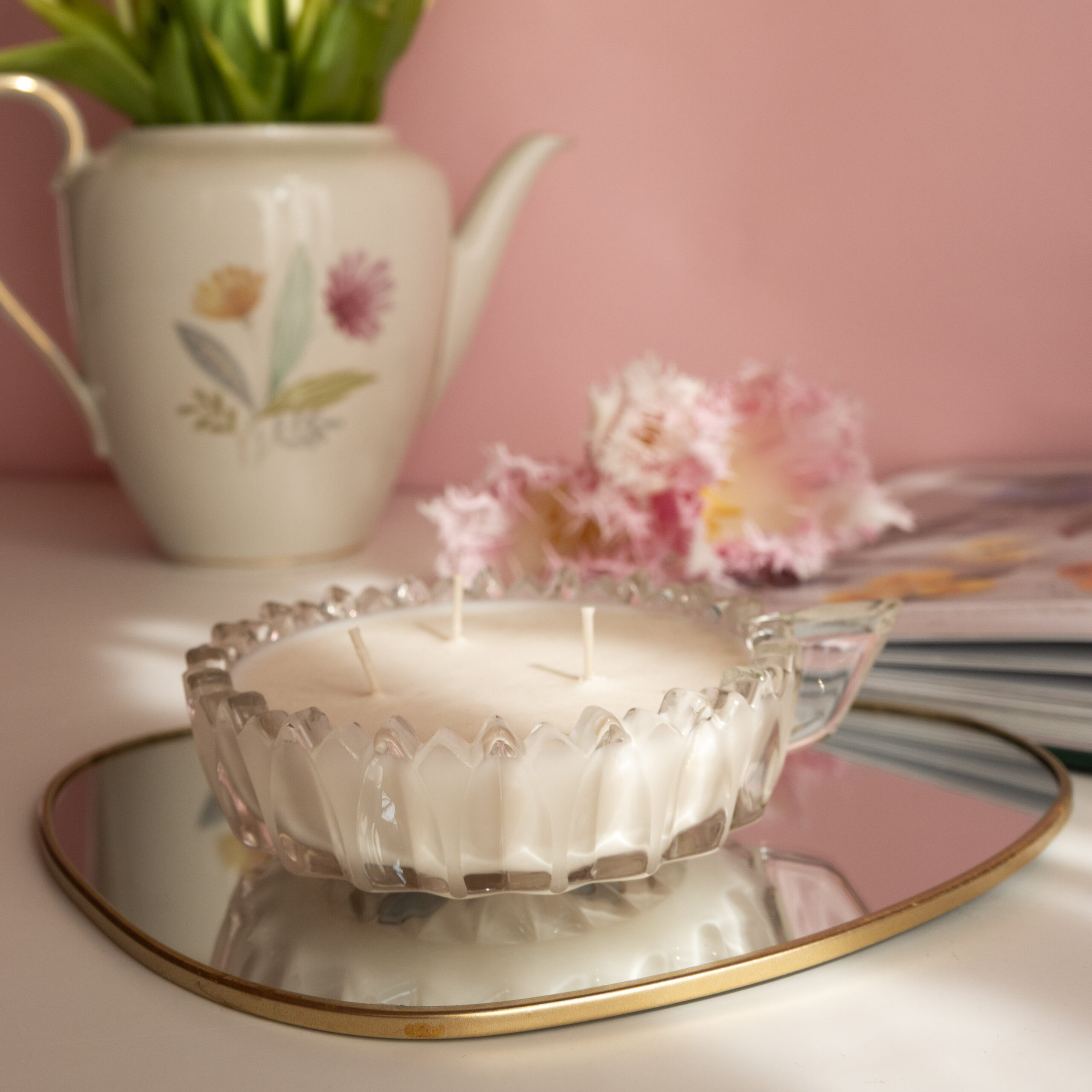Lumânare parfumată din ceară de soia, handmade, turnată manual într-o ceașcă din sticlă prețioasă, cu diametru mare.