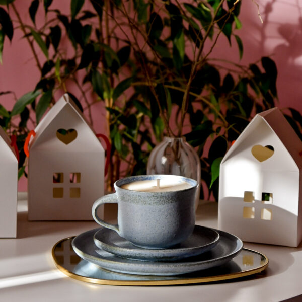 Lumânare parfumată din ceară 100% naturală de soia, turnată manual într-o cană ceramică bleu.