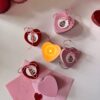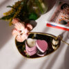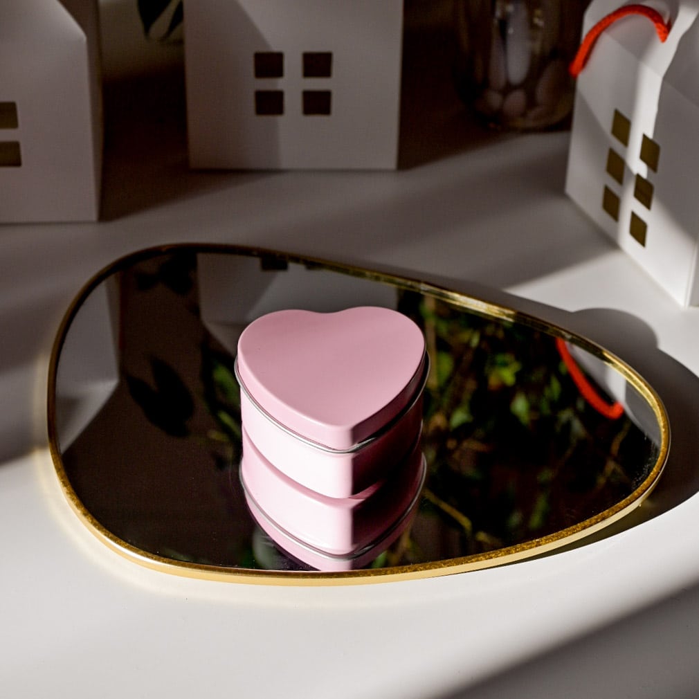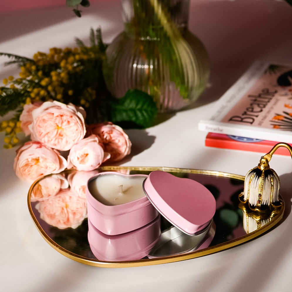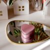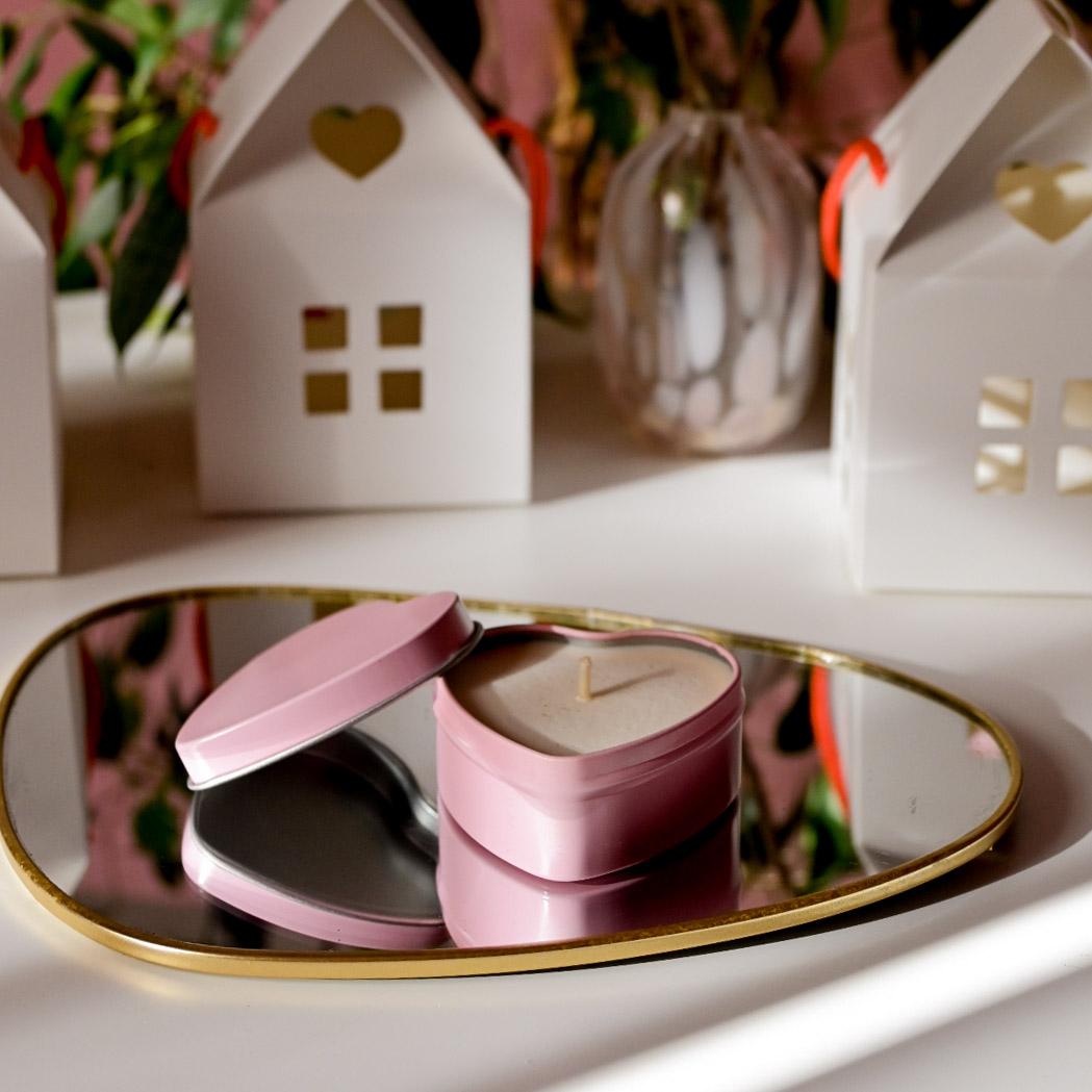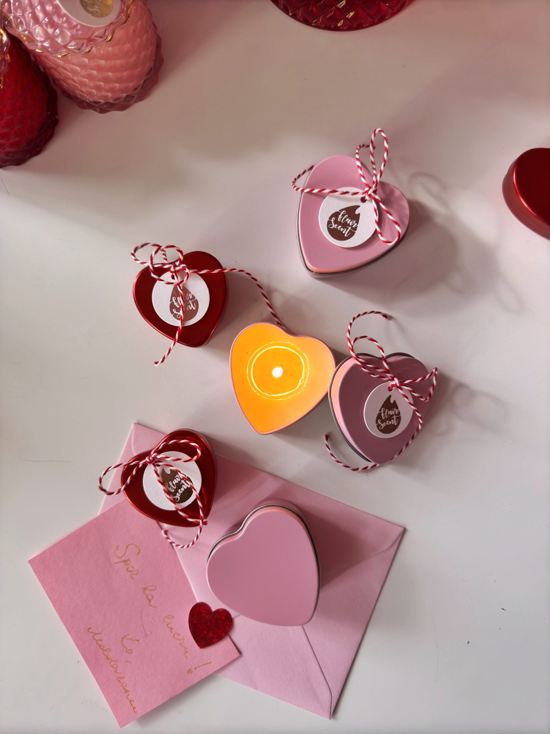 Recipientul lumânării este o inimă metalică, roz, pe care am denumit-o inimioară de călătorie pentru că e perfectă pentru a fi luată în vacanță, căci nu se sparge.