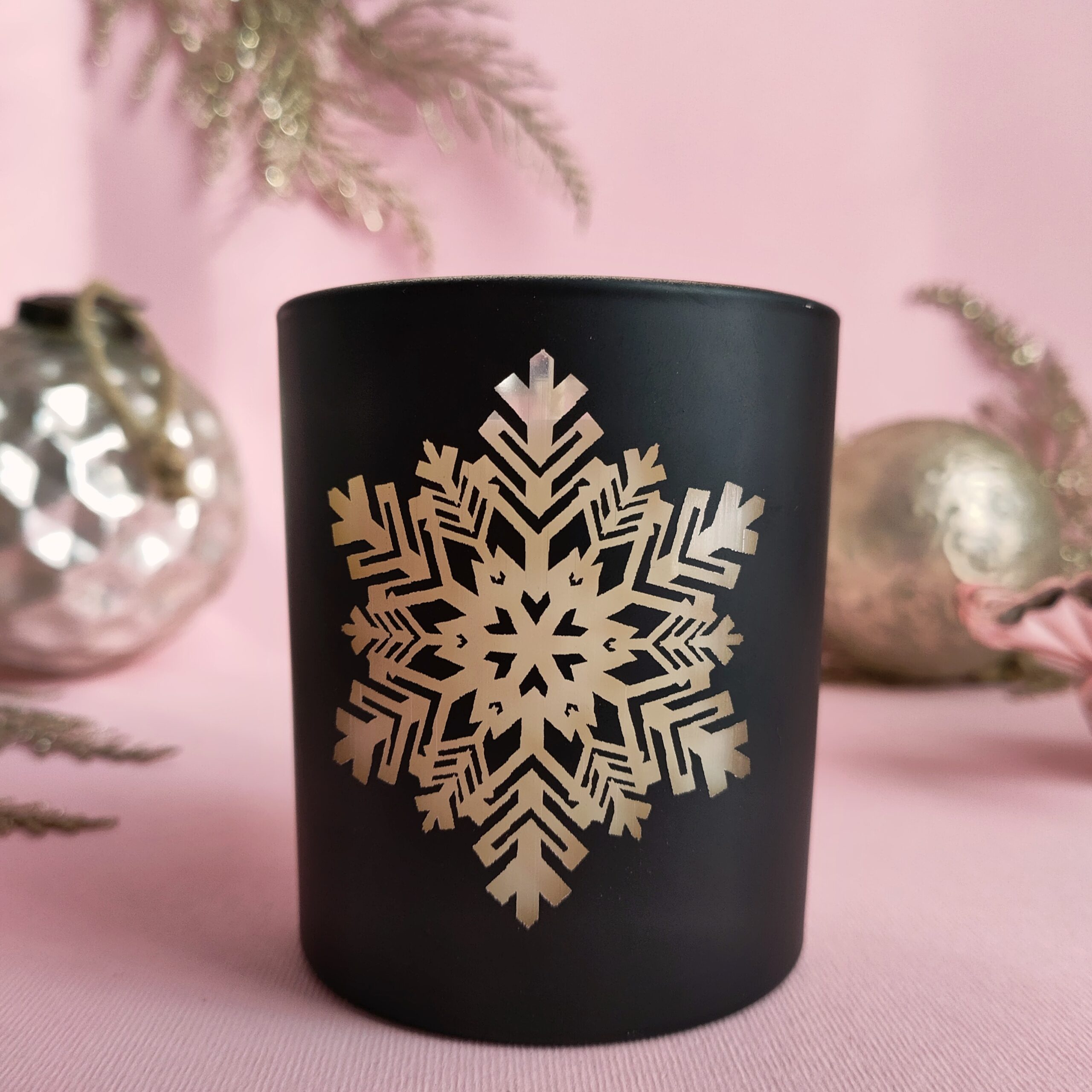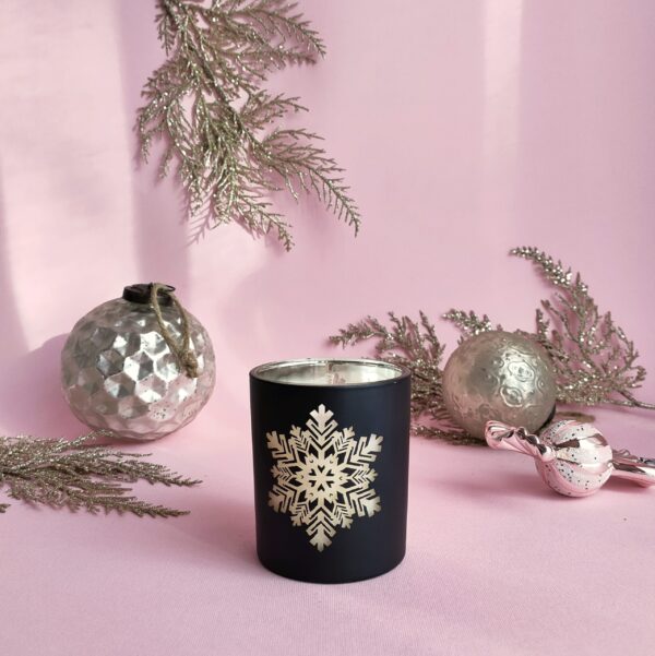 Lumânare parfumată din ceară 100% naturală de soia, turnată manual într-un vas de sticlă acoperit cu vopsea neagră, cu motivul unui fulg de nea transparent.