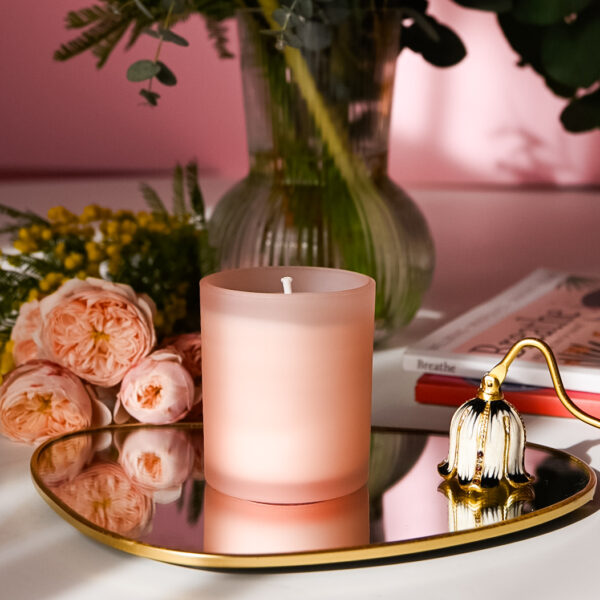 Lumânare parfumată din ceară 100% naturală de soia, turnată manual într-un vas de sticlă transparentă, de culoare roz mat.