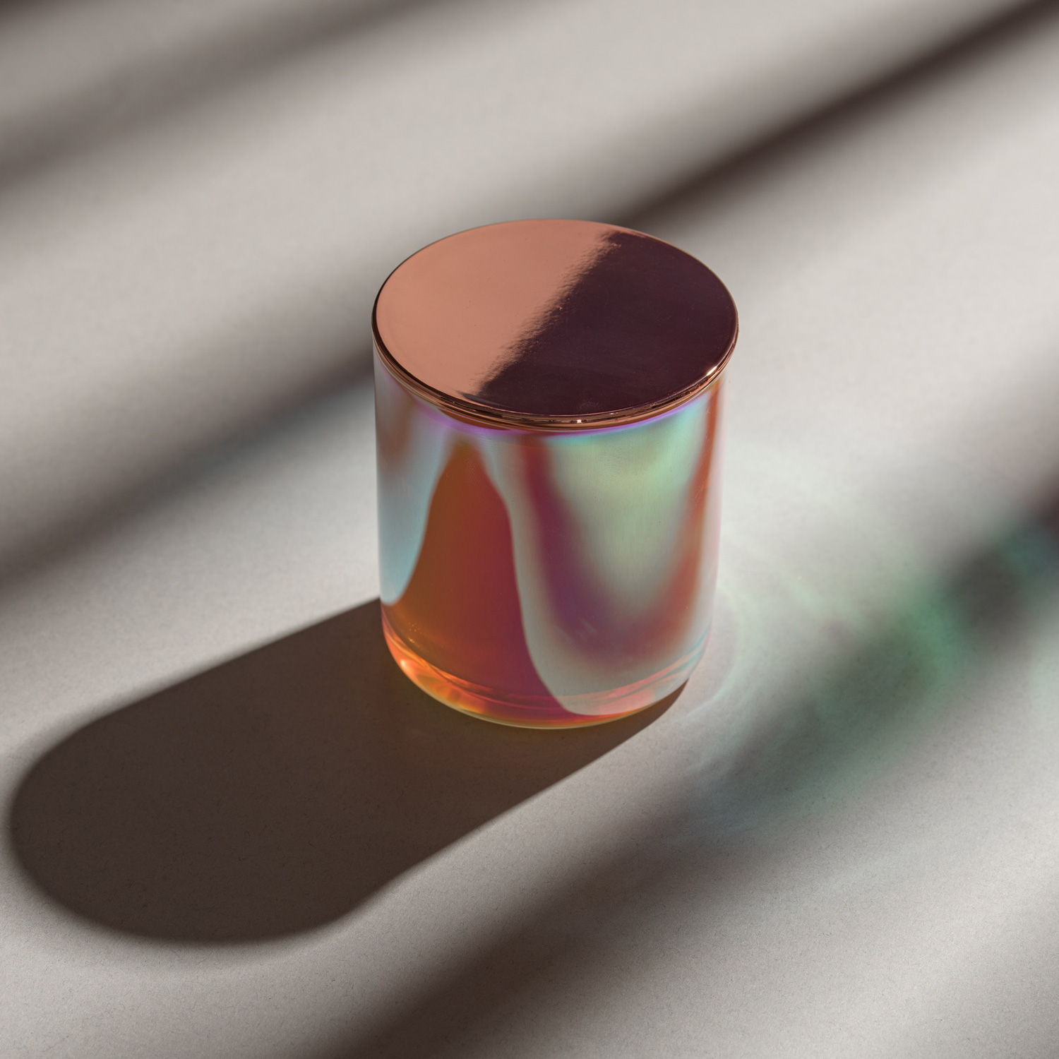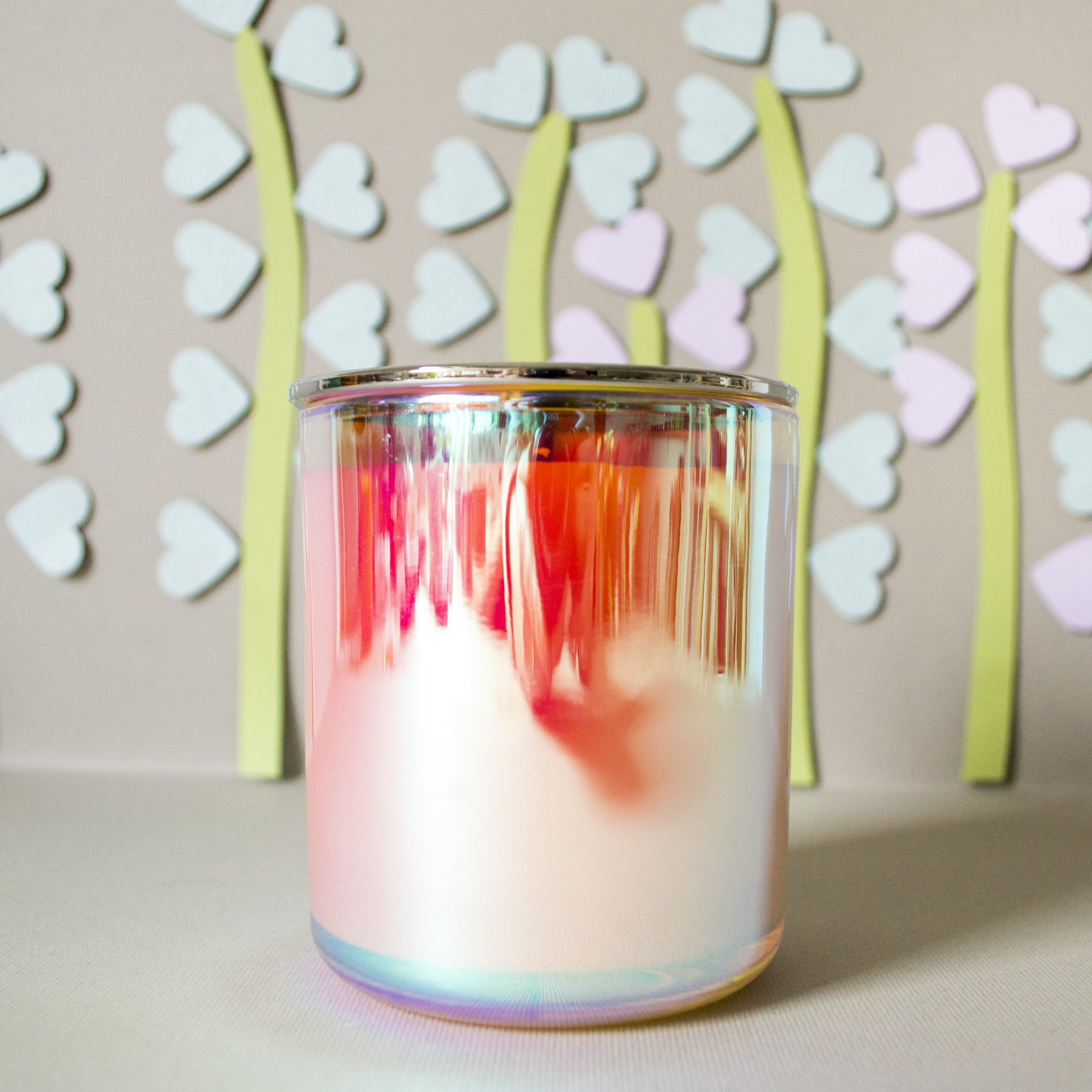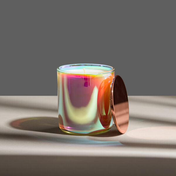 Lumânare parfumată din ceară 100% naturală de soia, turnată manual într-un pahar iridescent, ce creează un adevărat spectacol atunci când lumânarea este aprinsă.