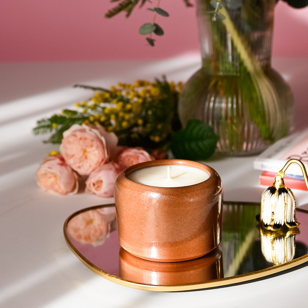 Lumânare parfumată din ceară de soia, handmade, turnată manual într-un vas ceramic de culoare maro.