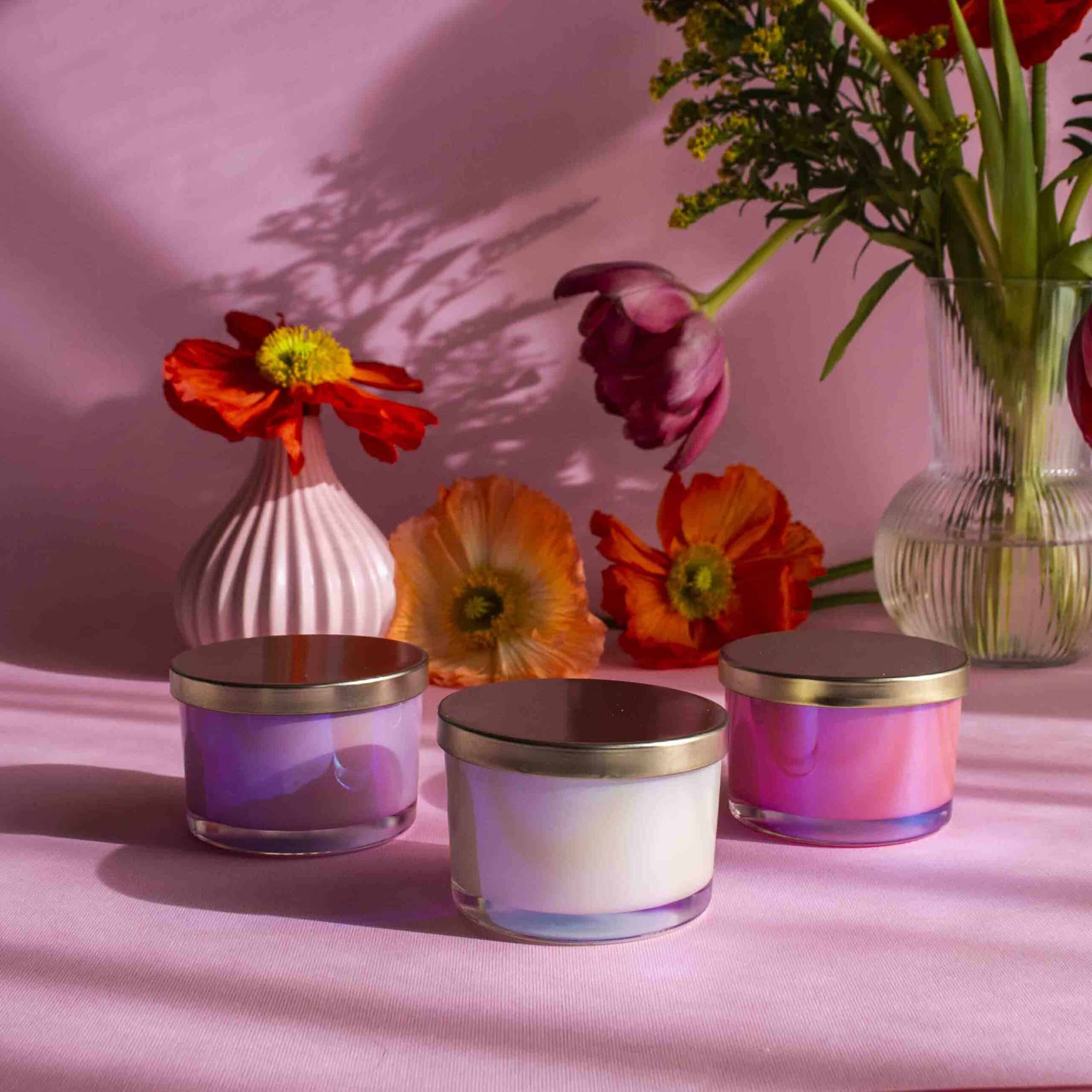 Recipientul face parte din colecția Bijuterii de casă, cu lumânări handmade în pahare și bomboniere de lux, de diferite forme și culori, pentru a aduce un plus de eleganță și parfum în casa ta. Vasul iridescent Alb dispersează lumina diafană a lumânării, creând astfel un decor feeric și elegant în orice încăpere.