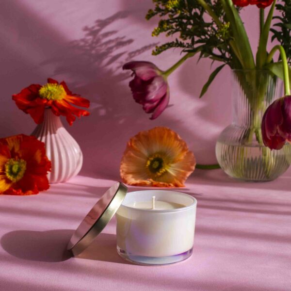 Lumânare parfumată din ceară 100% naturală de soia, turnată manual într-un vas elegant, din sticlă transparentă, acoperit cu un strat de vopsea alb iridescentă.