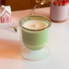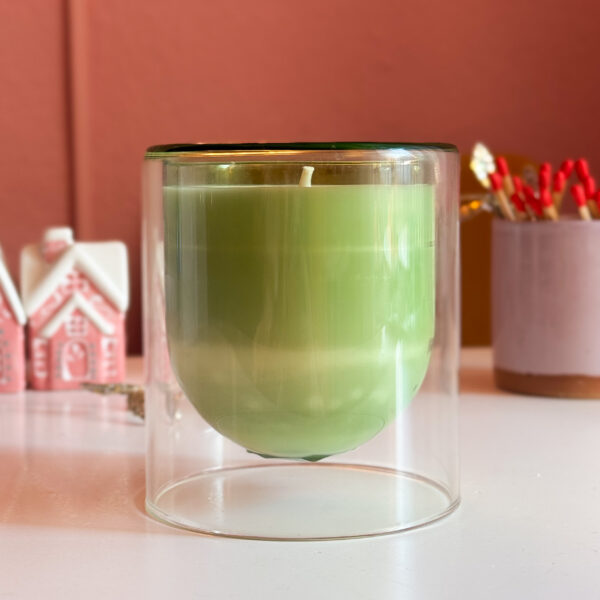 Lumânare parfumată din ceară de soia, handmade, turnată manual într-un pahar din sticlă transparentă verde cu perete dublu.