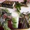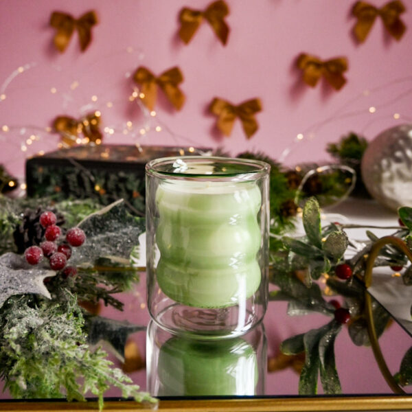 Lumânare parfumată din ceară de soia, handmade, turnată manual într-un pahar din sticlă transparentă verde cu perete dublu.