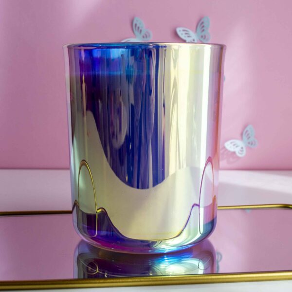 Lumânare parfumată din ceară 100% naturală de soia, turnată manual într-un pahar XXL din sticlă iridescentă, ce creează un adevărat spectacol atunci când lumânarea este aprinsă.