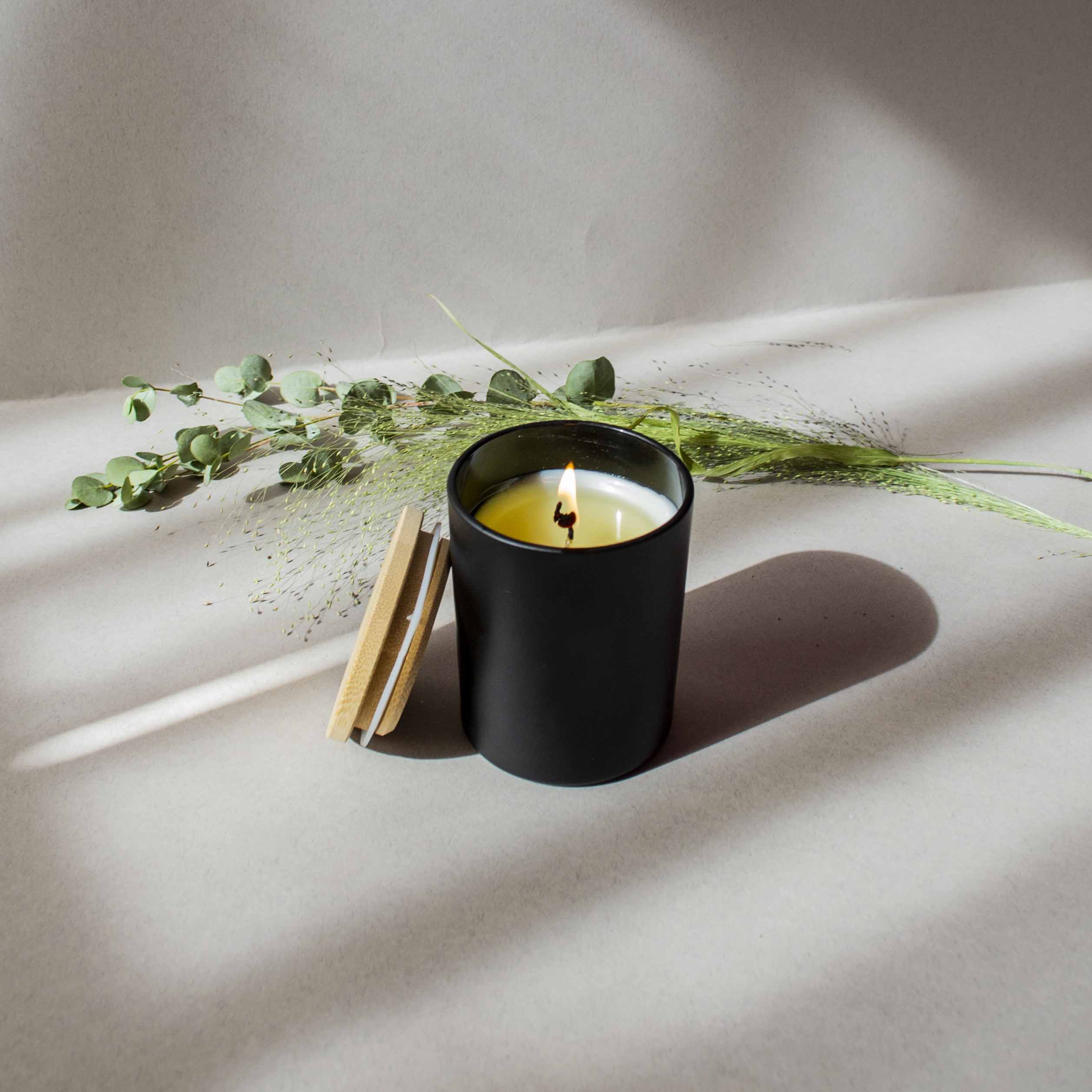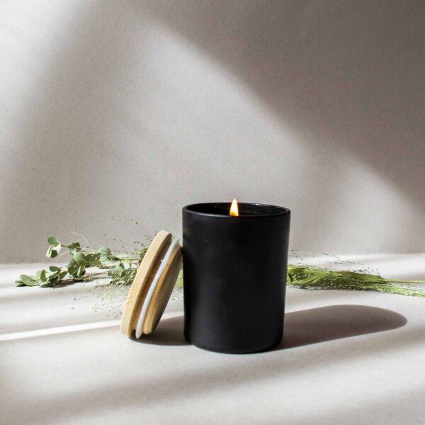 Lumânare parfumată din ceară de soia, turnată manual într-un pahar simplu din sticlă mată ce vine cu un capac din lemn.