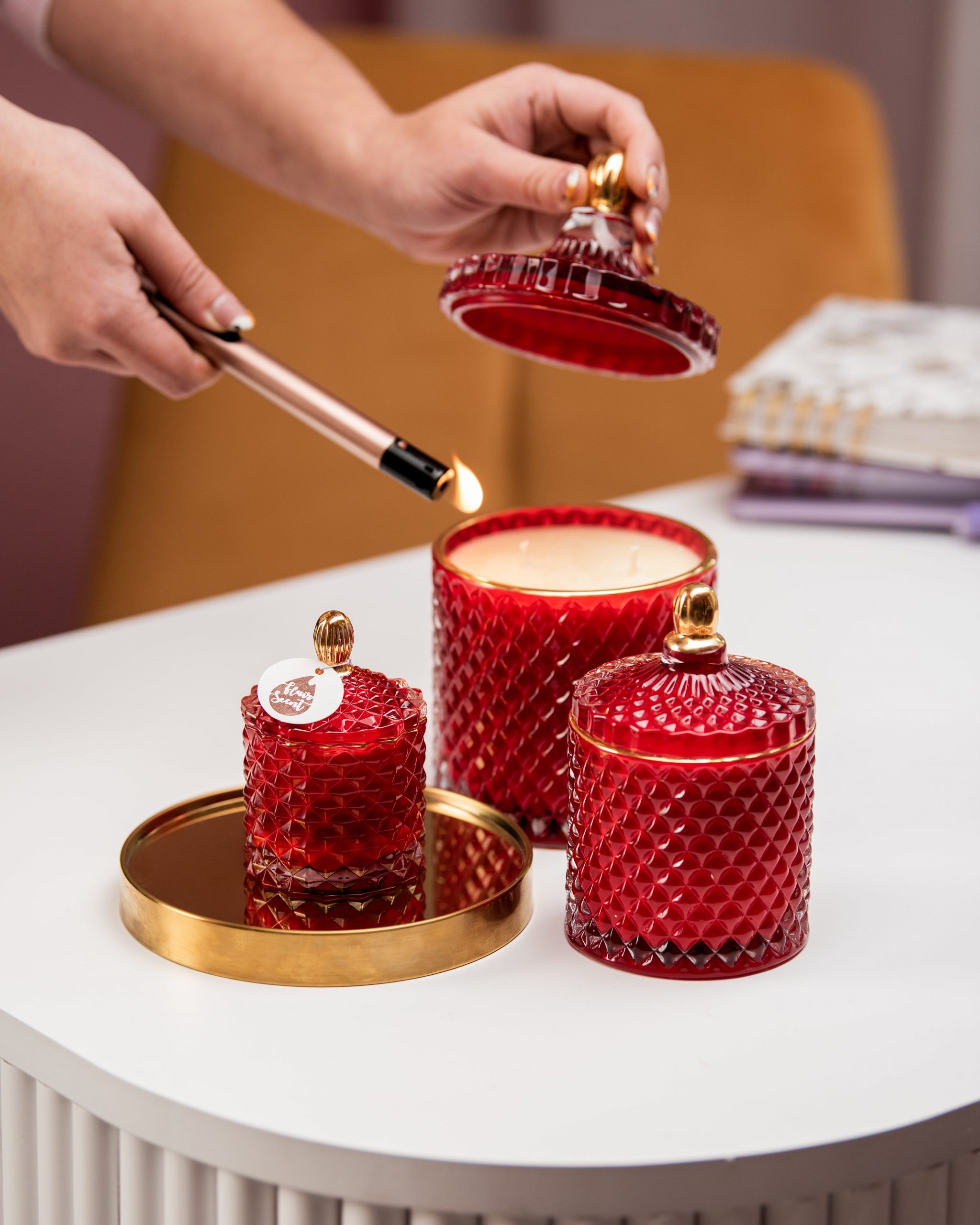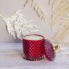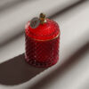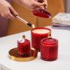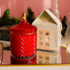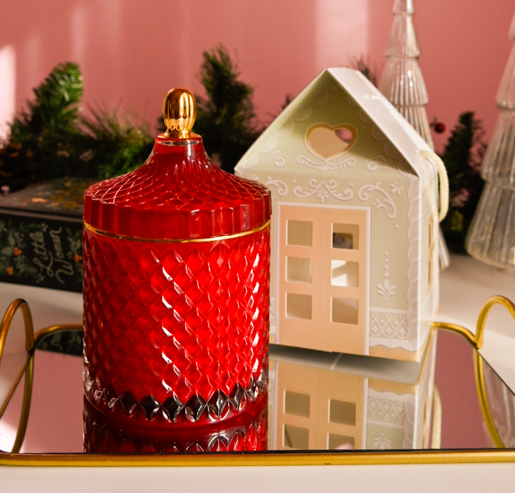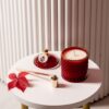 Lumânare parfumată din ceară 100% naturală de soia, turnată manual într-o bombonieră elegantă, din sticlă termorezistentă, roșie cu detalii aurii.