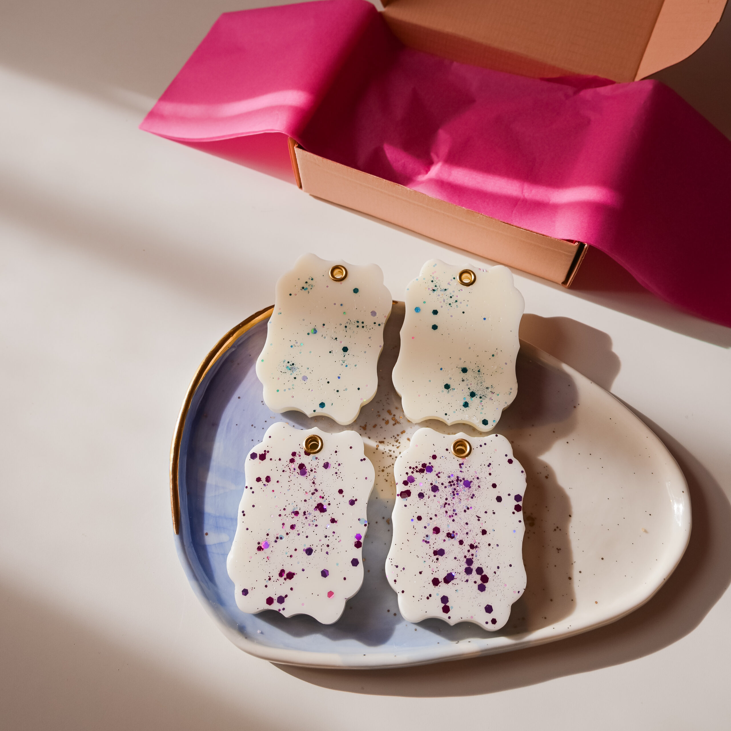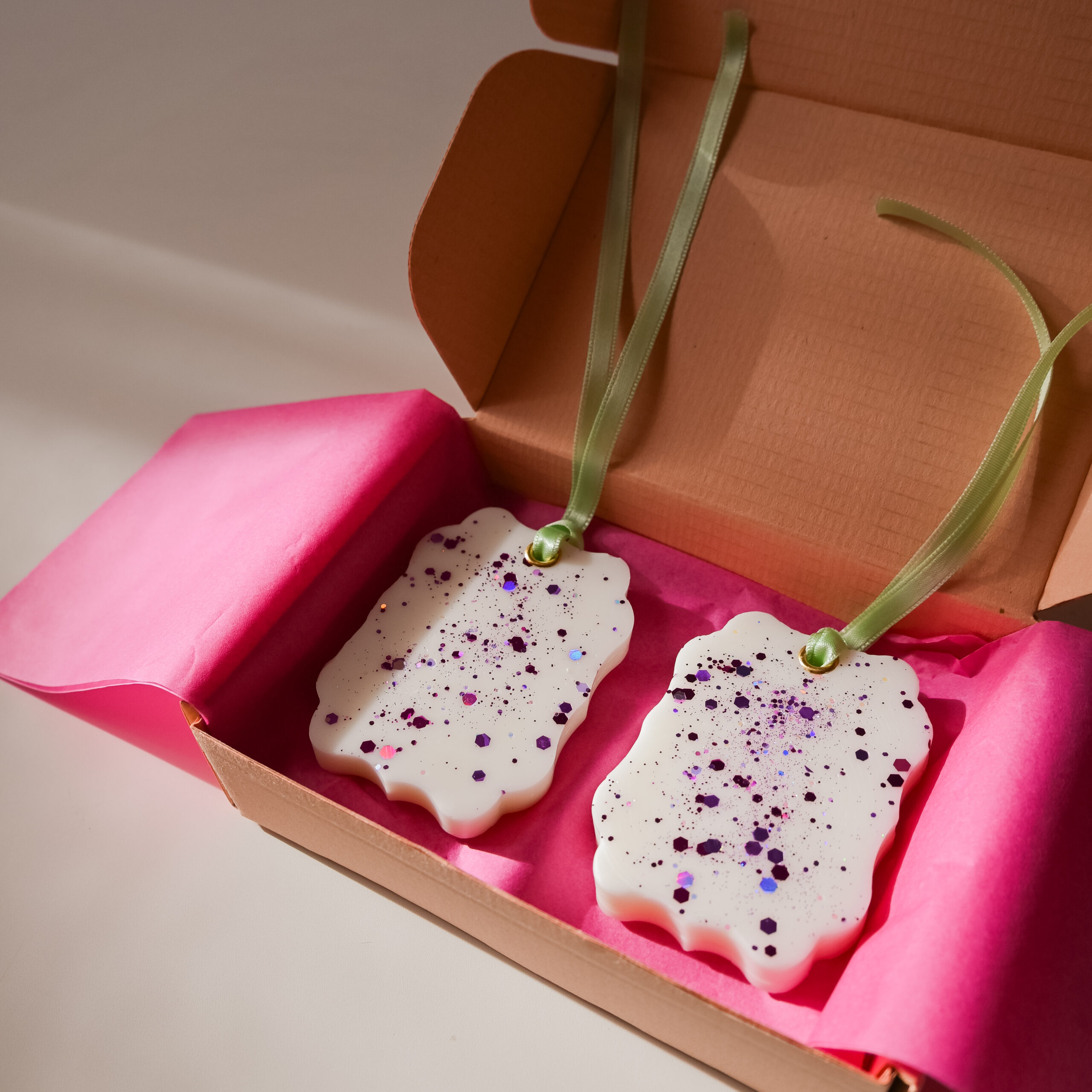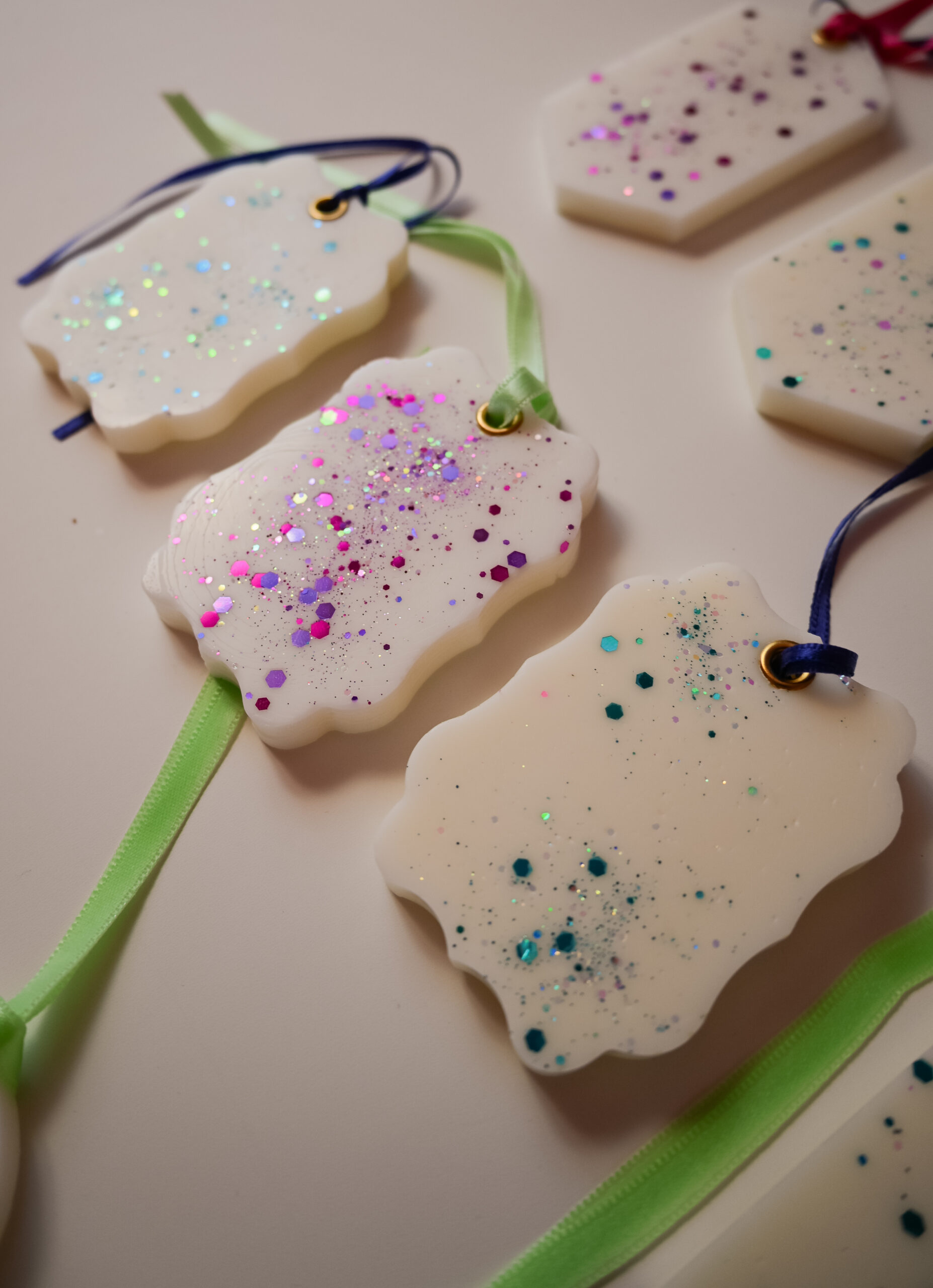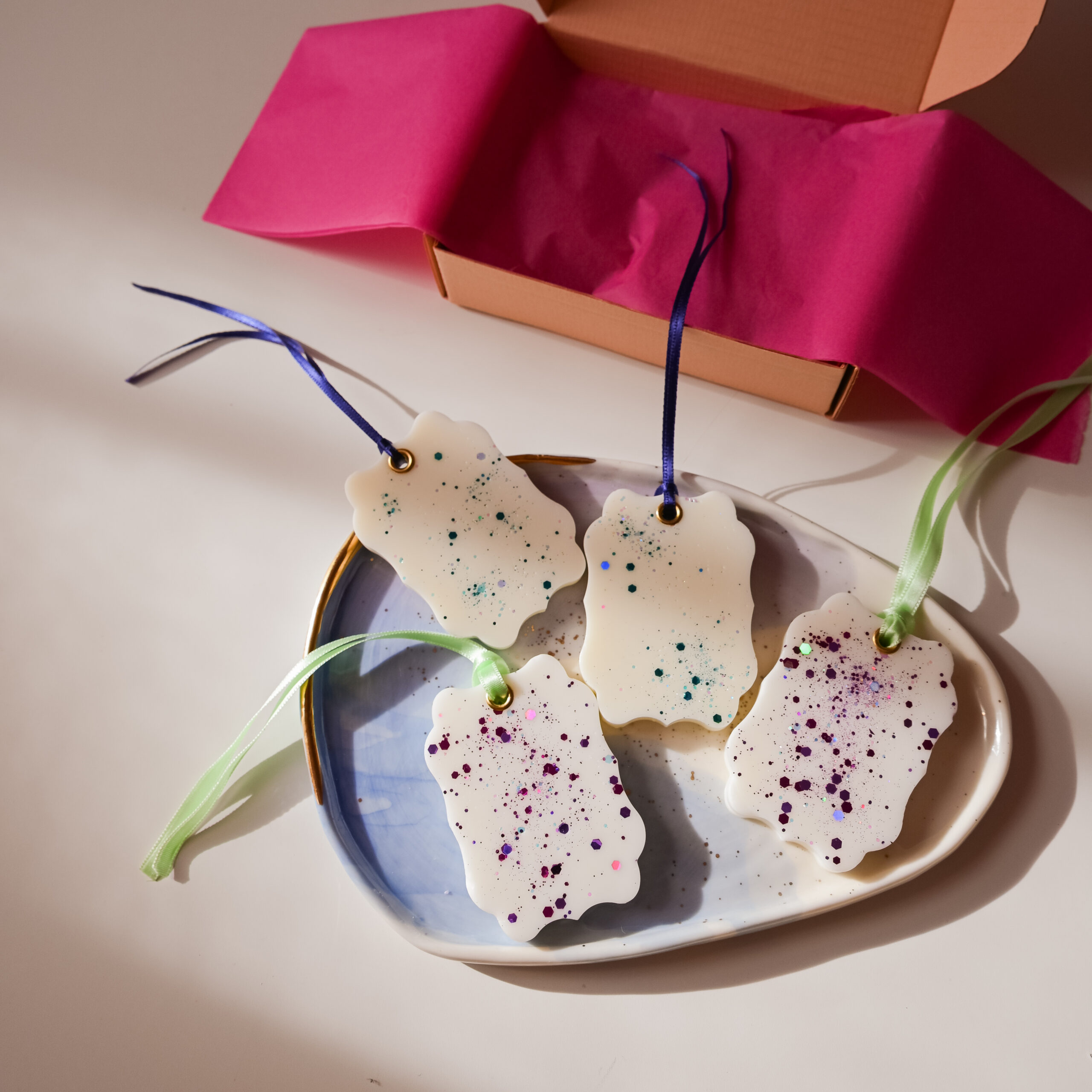 Odorizantele sunt turnate manual, decorate cu sclipici, parfumate și dotate cu o capsă și o panglică pentru a fi atârnate. Ceara odorizantelor este un amestec de ceară de soia și alte tipuri de ceară vegetală.