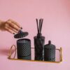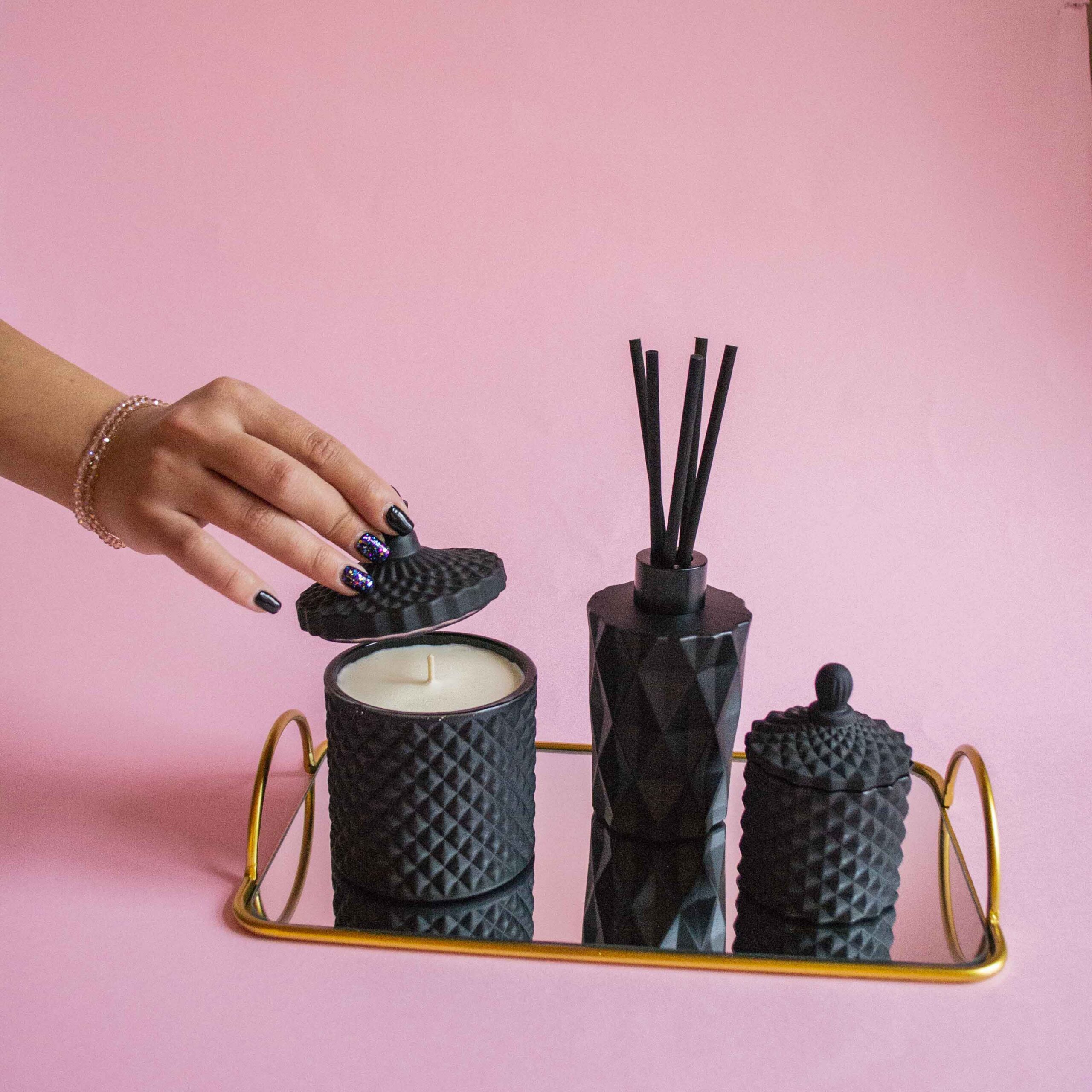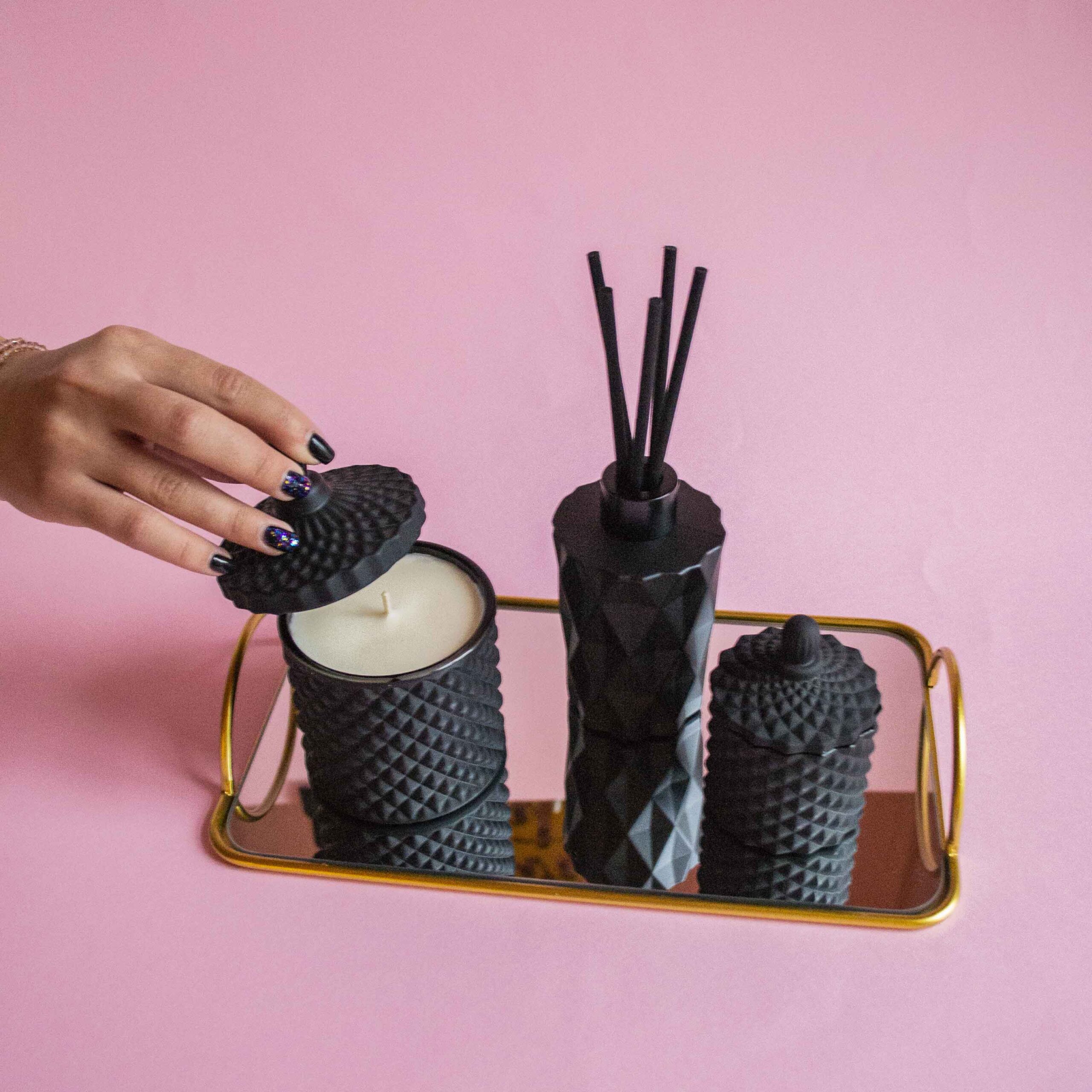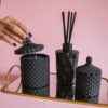 Setul conține un difuzor de parfum Diamant negru și 2 lumânări – o bombonieră Boem medie neagră cu 250g de ceară de soia și o bombonieră Baby Boem neagră cu 100g de ceară de soia.